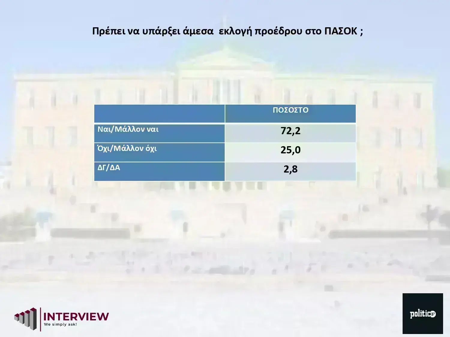 Σύμφωνα με τη δημοσκόπηση της Interview που διενεργήθηκε για λογαριασμό της POLITIC, εφτά στους δέκα θεωρούν ότι πρέπει να υπάρξει εκλογή νέου προέδρου για το σοσιαλδημοκρατικό κόμμα, μετά και από τα «στάσιμα» ποσοστά στις ευρωεκλογές.
