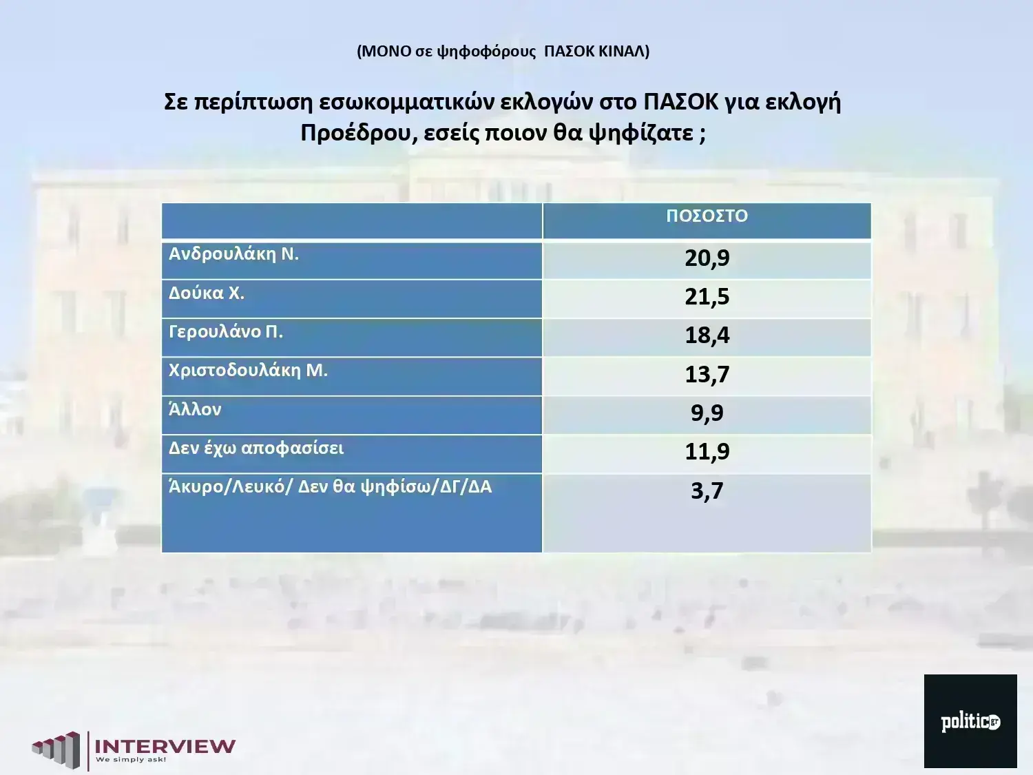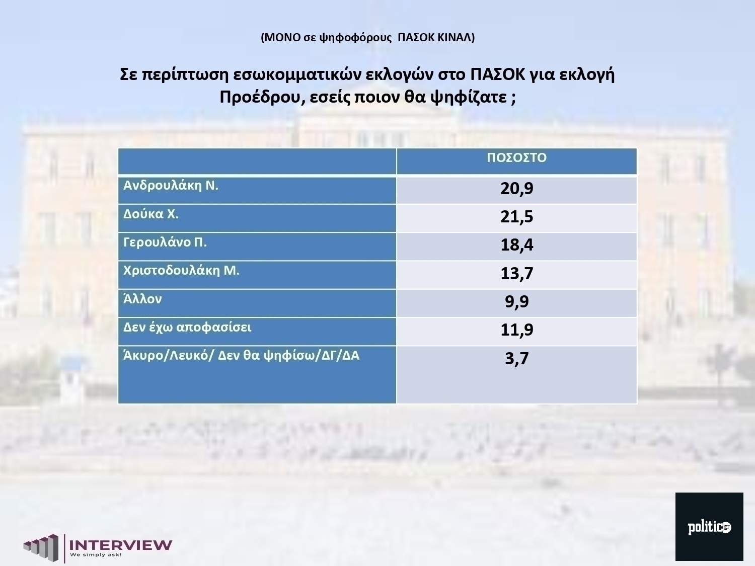 Με βραχεία κεφαλή προηγείται ο δήμαρχος της Αθήνας, Χάρης Δούκας με ποσοστό 21,5% και ακολουθεί ο νυν πρόεδρος του ΠΑΣΟΚ, Νίκος Ανδρουλάκης με ποσοστό 20,9%. Τρίτο κατατάσσουν οι ψηφοφόροι του ΠΑΣΟΚ τον Παύλο Γερουλάνο (18,4%) ο οποίος έχει και αυτός ταχθεί υπέρ της άμεσης εκλογής ηγεσίας από τη βάση. Σημειώνεται πως η έρευνα μέτρησε και την υποψηφιότητα του Μανώλη Χριστοδουλάκη (13,7%), καθώς αποσύρθηκε κατά τη διάρκεια αυτής. Δεδομένου ότι ο κ. Χριστοδουλάκης εξέφρασε την στήριξή του στην υποψηφιότητα Δούκα για την ηγεσία του κόμματος, η απόσυρση της υποψηφιότητάς του ευνοεί αυτή του κ. Δούκα.