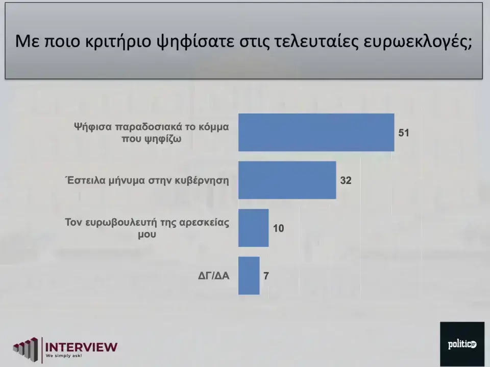Σύμφωνα με την έρευνα, ένας στους δύο ψήφισε παραδοσιακά το κόμμα που ψηφίζει. Τρεις στους δέκα έστειλαν μήνυμα στην κυβέρνηση, ενώ μόλις ένας στους δέκα ψήφισε τον ευρωβουλευτή της αρεσκείας του.