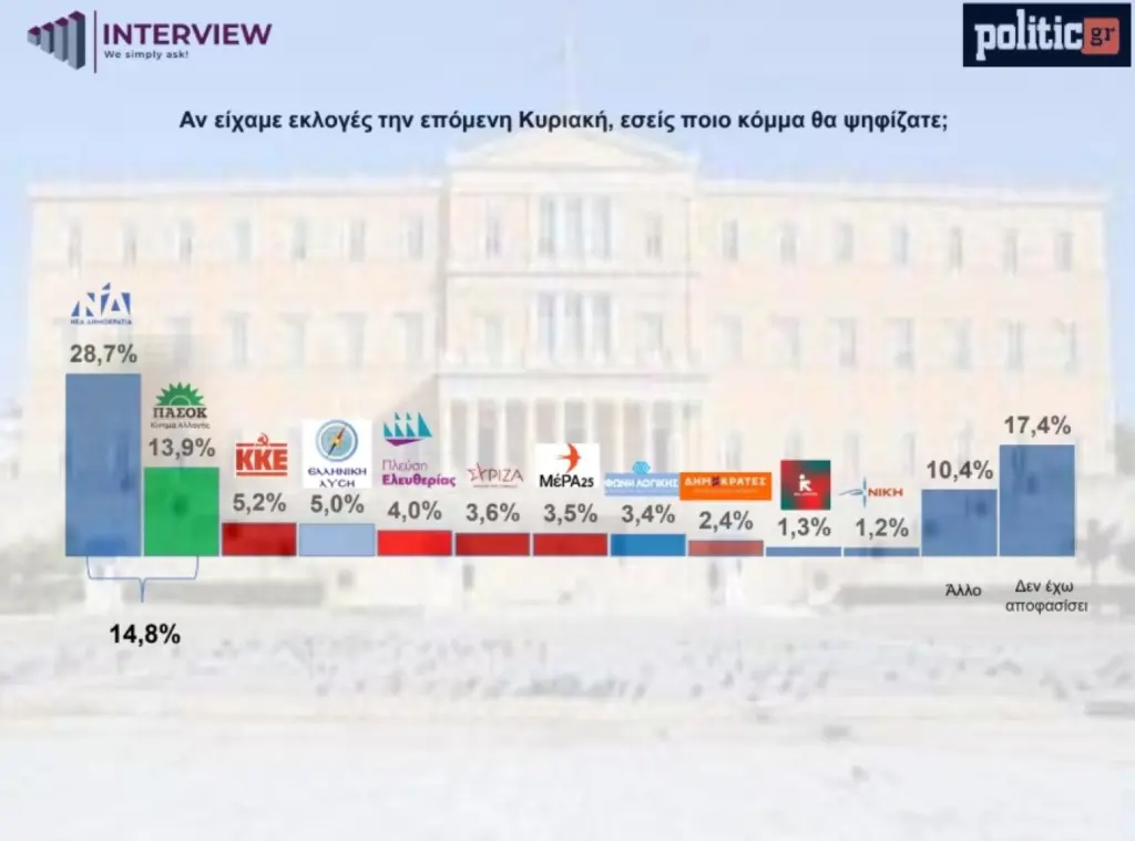 Σταθερό προβάδισμα για τη Νέα Δημοκρατία, μικρές μετατοπίσεις στα χαμηλότερα ποσοστά και έντονο «γκρίζο» στους αναποφάσιστους καταγράφει η δημοσκόπηση της Interview για λογαριασμό της POLITIC για το μήνα Μάρτιο.