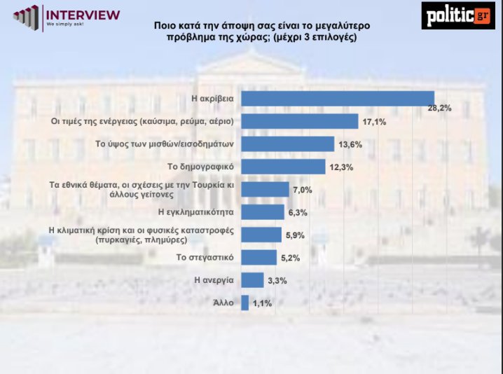 Ακρίβεια, υψηλές τιμές ενέργειας, χαμηλοί μισθοί, δημογραφικό και εθνικά θέματα συμπληρώνουν την πρώτη πεντάδα με τα μεγαλύτερα προβλήματα της χώρας σύμφωνα με τους συμμετέχοντες στην έρευνα.