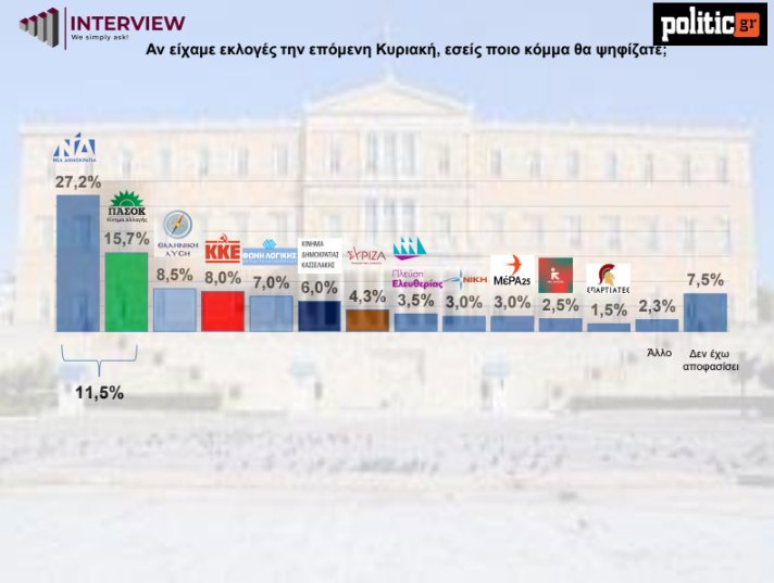 Η ΝΔ αυξάνει οριακά τις δυνάμεις της καταγράφοντας ποσοστό 27,2%, το ΠΑΣΟΚ σημειώνει ποσοστό 15,7%, ενώ ο ΣΥΡΙΖΑ βρίσκεται σε ιστορικό χαμηλό καθώς βρίσκεται πλέον στην έβδομη θέση με ποσοστό 4,3%. Σημειώνεται πως η δημοσκόπηση πραγματοποιήθηκε πριν από την εκλογή του Σωκράτη Φάμελλου στην προεδρία του ΣΥΡΙΖΑ.