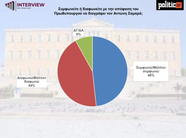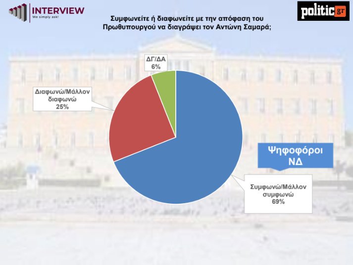Στα εσωκομματικά της ΝΔ και αναφορικά με την απόφαση του Κυριάκου Μητσοτάκη να διαγράψει τον πρώην πρωθυπουργό, το κυβερνων κόμμα φαίνεται πως βγαίνει ενισχυμένο. Οι ψηφοφόροι της ΝΔ (7 στους 10) συμφωνούν. Στο σύνολο των ερωτηθέντων συμφωνεί το 48% και το 44% διαφωνεί.