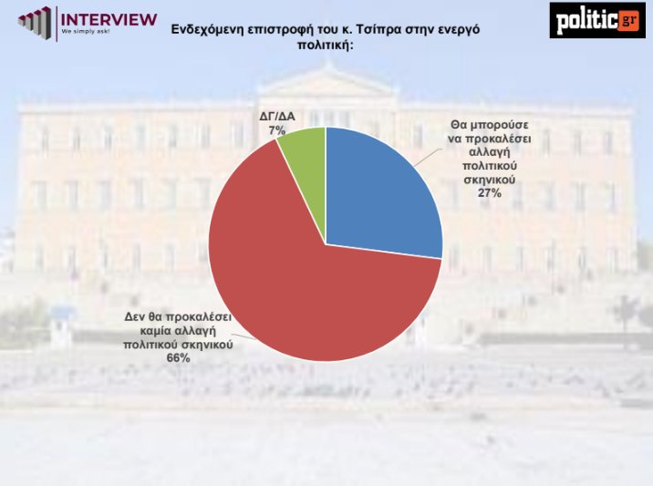 Ανάμεσα στις ερωτήσεις που κλήθηκαν να απαντήσουν οι συμμετέχοντες στην δημοσκόπηση της Interview ήταν για ενδεχόμενη επιστροφή του Αλέξη Τσίπρα στην ενεργό πολιτική. Το 66% απάντησε πως δεν θα προκαλούσε καμία αλλαγή στο πολιτικό σκηνικό και το 27% ότι θα προκαλούσε.