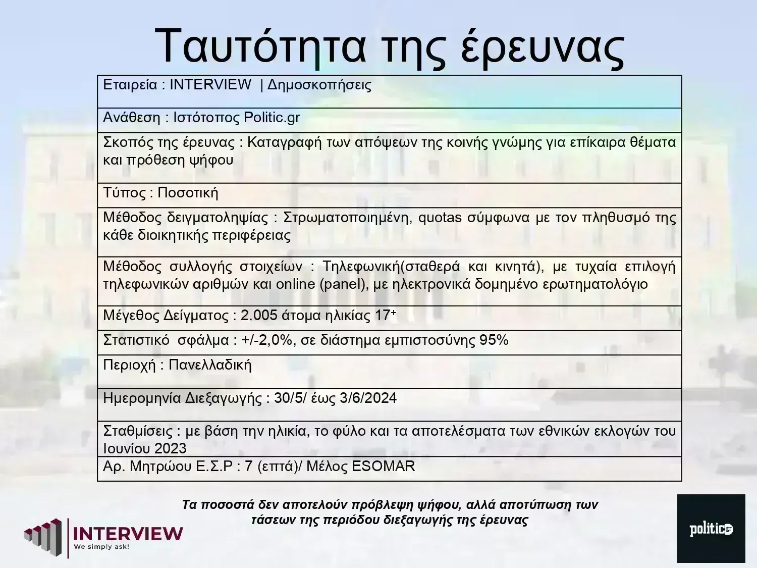 Συγκεκριμένα, από το 14,5% (έρευνα Μαΐου) η ψαλίδα μεταξύ της Νέας Δημοκρατίας και του ΣΥΡΙΖΑ κλείνει στο 12,9%. Η ΝΔ καταγράφει μια πτώση 1,5 μονάδας ενώ ο ΣΥΡΙΖΑ είναι σταθερά δεύτερος στο 15,6%, με «καθαρή» διαφορά από το τρίτο ΠΑΣΟΚ, το οποίο οπισθοχωρεί μισή μονάδα (10,5%). ΚΚΕ (6,3%) και Ελληνική Λύση (7%) διατηρούν τα ποσοστά του προηγούμενου μήνα. ΝΙΚΗ, Νέα Αριστερά, Πλεύση Ελευθερίας, Φωνή Λογικής είναι κοντά στο να περάσουν το κατώφλι του 3%, χωρίς όμως να είναι δεδομένο ότι θα βγάλουν ευρωβουλευτή. Ποσοστό ασφαλείας θεωρείται το 3,5%.