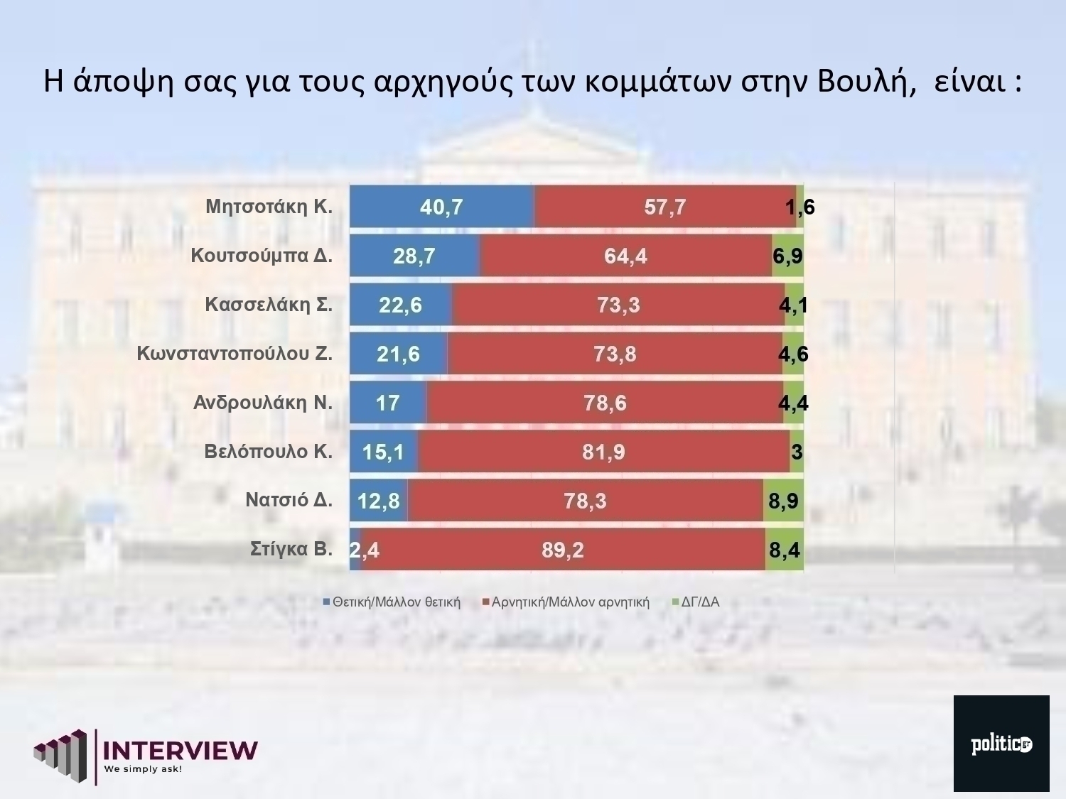 Στις δημοφιλίες των πολιτικών αρχηγών, πρώτος είναι ο Κυριάκος Μητσοτάκης που συγκεντρώνει 40,7% σε θετικές απόψεις. Δεύτερος είναι ο Δημήτρης Κουτσούμπας με 28,7% και ακολουθεί ο Στέφανος Κασσελάκης με 22,6%, η Ζωή Κωνσταντοπούλου με 21,6%, ο Νίκος Ανδρουλάκης με 17%, ο Κυριάκος Βελόπουλος (15,1%), ο Δημήτρης Νατσιός (12,8) και τέλος ο Βασίλης Στίγκας (2,4%).