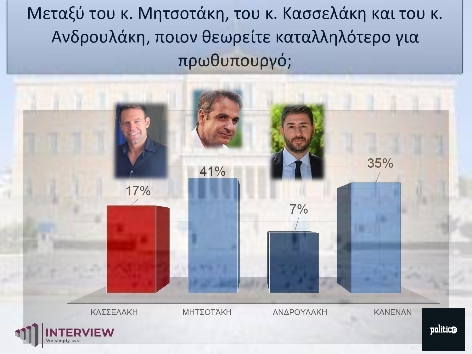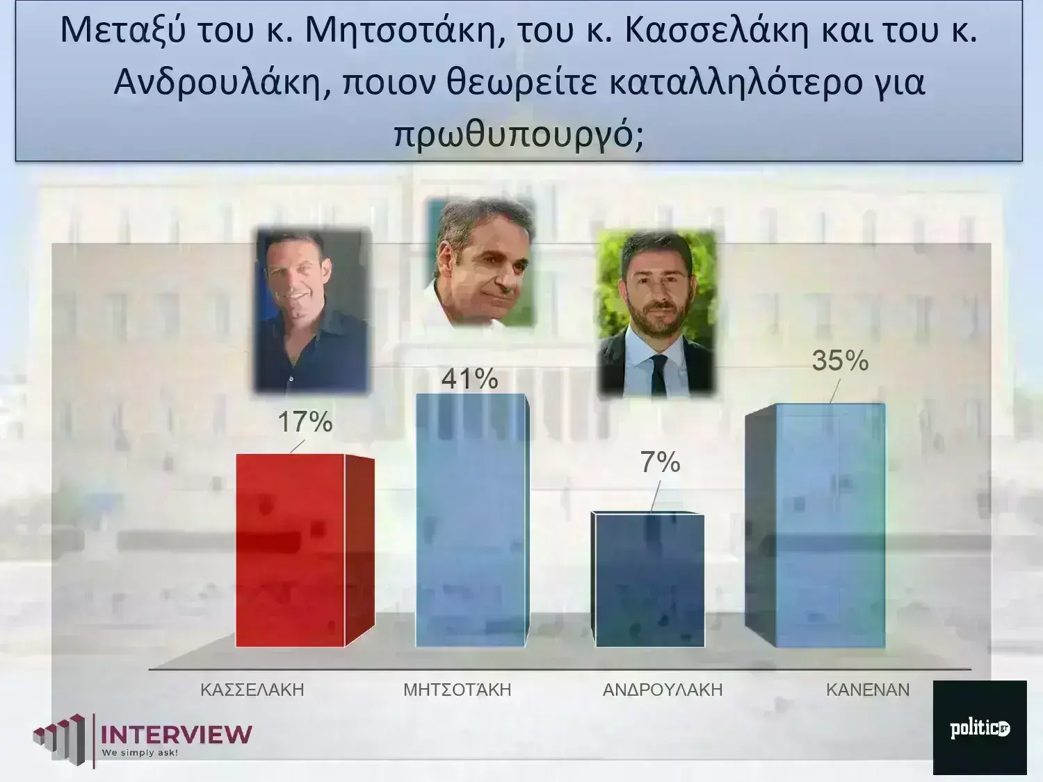 Όσον αφορά τη γνώμη των πολιτών για τον καταλληλότερο πρωθυπουργό, ο Κυριάκος Μητσοτάκης παραμένει στην πρώτη θέση με 41%, δεύτερος είναι ο κανένας (35%) και τρίτος ο Στέφανος Κασσελάκης, ο οποίος από το 15% (τον προηγούμενο μήνα) ανέβηκε στο 17%. Ο Νίκος Ανδρουλάκης είναι σταθερά στο 7%.