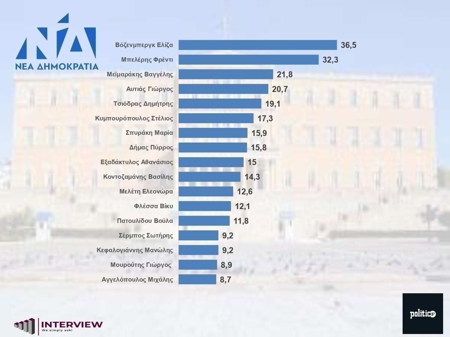 Μεταξύ των υποψήφιων ευρωβουλευτών της ΝΔ, πρώτη στις προτιμήσεις των ερωτηθέντων έρχεται η Ελίζα Βόζεμπεργκ με 36,5%. Ακολουθεί ο Φρέντι Μπελέρης (32,3%), ο Βαγγέλης Μεϊμαράκης (21,8%), ο Γιώργος Αυτιάς (20,7%), ο Δημήτρης Τσιόδρας (19,1%), ο Στέλιος Κυμπουρόπουλος (17,3%), η Μαρία Σπυράκη (15,9%), ο Πύρρος Δήμας (15,8%).