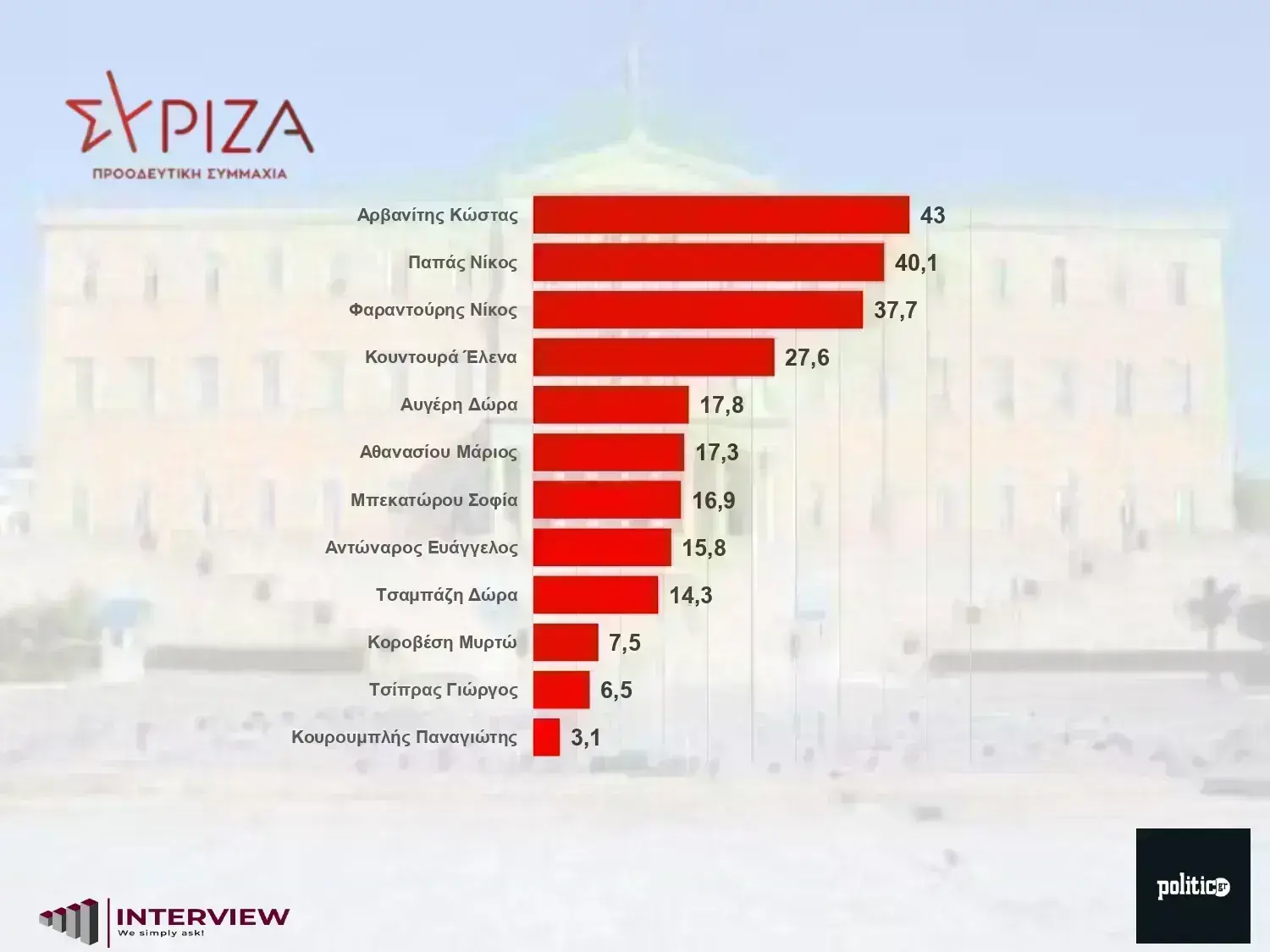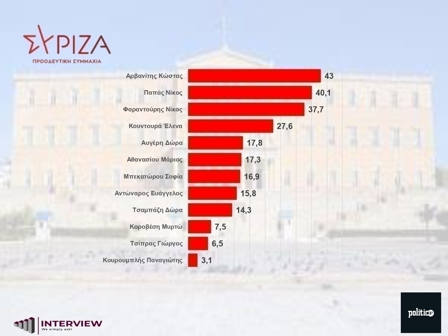 Στην πρώτη πεντάδα των υποψηφίων του ΣΥΡΙΖΑ προηγείται ο Κώστας Αρβανίτης με 43% και ακολουθούν: ο Νίκος Παππάς 40,1%, ο Νικόλας Φαραντούρης 37,7%, η Έλενα Κουντουρά 27,6% και η Δώρα Αυγέρη 17,8%.