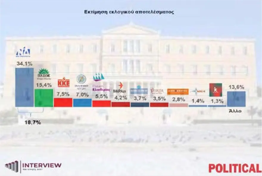 Συγκεκριμένα, στην εκτίμηση εκλογικού αποτελέσματος η ΝΔ αυξάνει τα ποσοστά της στο 34,1% και ακολουθούν το ΠΑΣΟΚ με 15,4%, το ΚΚΕ με 7,5%, η Ελληνική Λύση με 7%, η Πλεύση Ελευθερίας με 5,5%, το ΜέΡΑ25 με 4,2%, η Φωνή Λογικής με 3,7%, ο ΣΥΡΙΖΑ με 3,5%, οι Δημοκράτες με 2,8%, η Νίκη με 1,4%, η Νέα Αριστερά με 1,3% και «άλλο» με 13,6%.