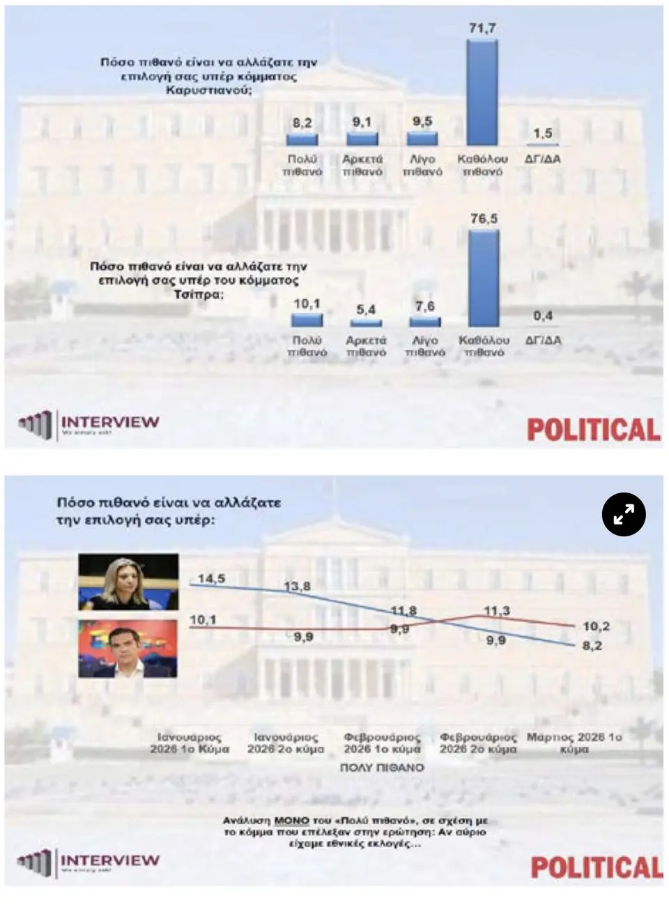 Στη δημοσκόπηση καταγράφεται, τέλος, και νέα πτώση για τη Μαρία Καρυστιανού, με μόλις το 8,2% να θεωρεί πολύ πιθανό να αλλάξει την επιλογή του υπέρ ενός νέου κόμματος υπό την ηγεσία της, ενώ σε ό,τι αφορά τον Αλέξη Τσίπρα το αντίστοιχο ποσοστό μετρήθηκε στο 10,1%.