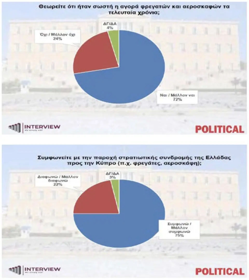 Οι συμμετέχοντες στη δημοσκόπηση ρωτήθηκαν και για την αποστολή των φρεγατών «Κίμων» και «Ψαρά» και τεσσάρων F-16 στην Κύπρο, με το 75% να απαντά «συμφωνώ / μάλλον συμφωνώ» και το 22% «διαφωνώ / μάλλον διαφωνώ». Παρόμοια είναι, δε, και τα ποσοστά για το αν ήταν σωστή η αγορά φρεγατών και αεροσκαφών τα τελευταία χρόνια», με το 72% να απαντά «ναι» και το 24% «όχι».