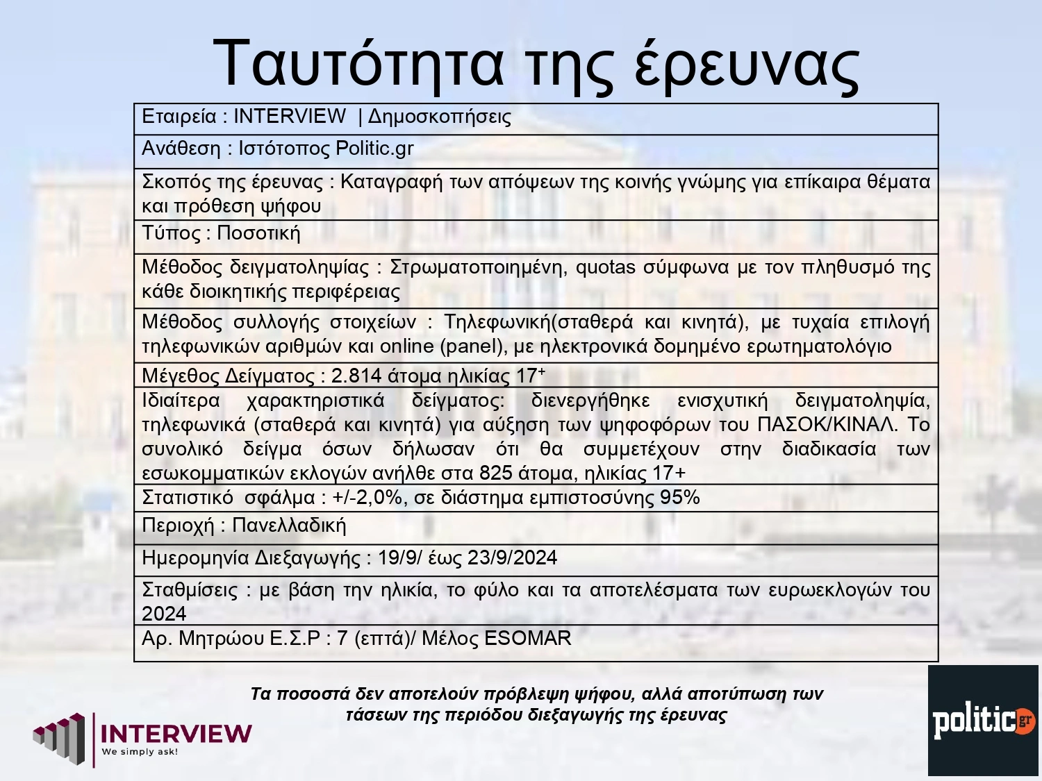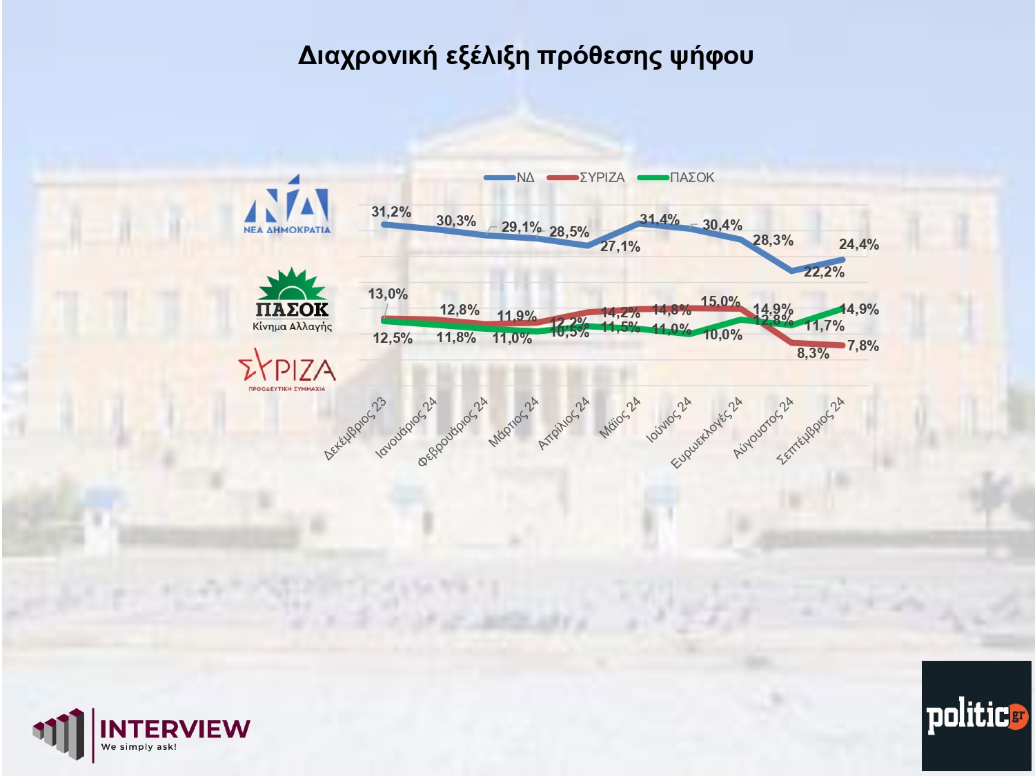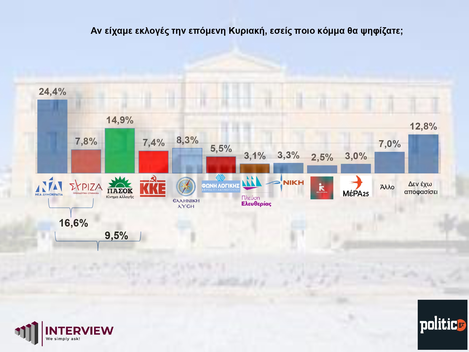 Συγκεκριμένα, στην πρόθεση ψήφου, η Νέα Δημοκρατία συγκεντρώνει 24,4% (από 22,2%), το ΠΑΣΟΚ 14,9% (από 11,7%), η Ελληνική Λύση 8,3% (από 8,8%), ο ΣΥΡΙΖΑ 7,8% (από 8,3%), το ΚΚΕ 7,4% (από 8,7%), η Φωνή Λογικής 5,5% (από 4%), το κόμμα Νίκη 3,3% (σταθερό), η Πλεύση Ελευθερίας 3,1% (από 3,9%), το ΜέΡΑ25 3%, η Νέα Αριστερά 2,5%. Η αδιευκρίνιστη ψήφος είναι στο 19,8%.