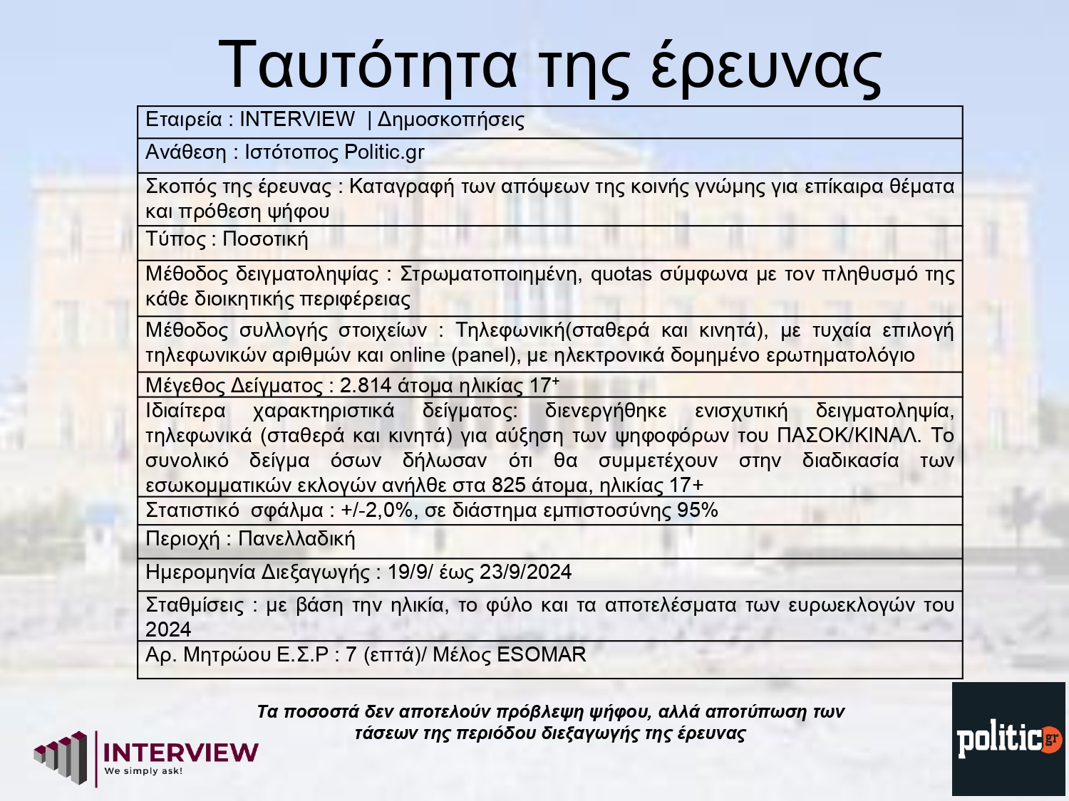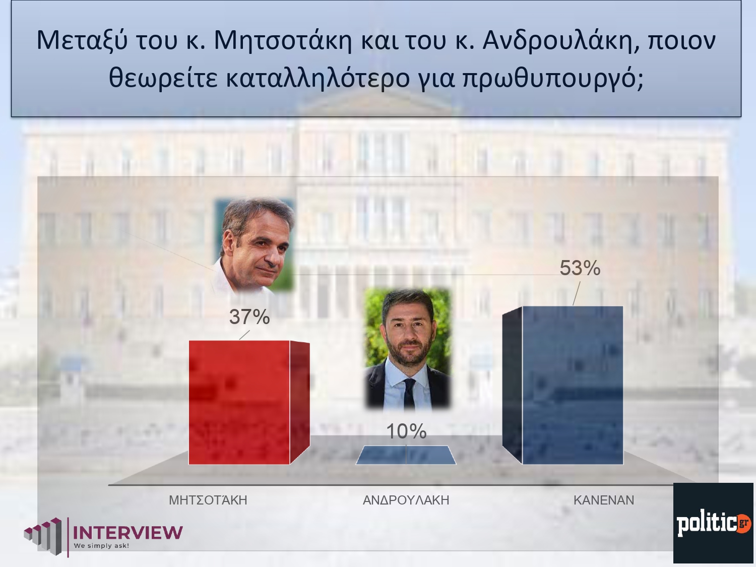 Αν και ο σημερινός πρόεδρος του ΠΑΣΟΚ είναι φαβορί και το πιο πιθανόν είναι ότι θα περάσει στον δεύτερο γύρο, δεν έχει χτίσει ισχυρό πρωθυπουργικό προφίλ με αποτέλεσμα, μόλις ένας στους δέκα να θεωρεί ότι είναι καταλληλότερος για πρωθυπουργός από τον Κυριάκο Μητσοτάκη.