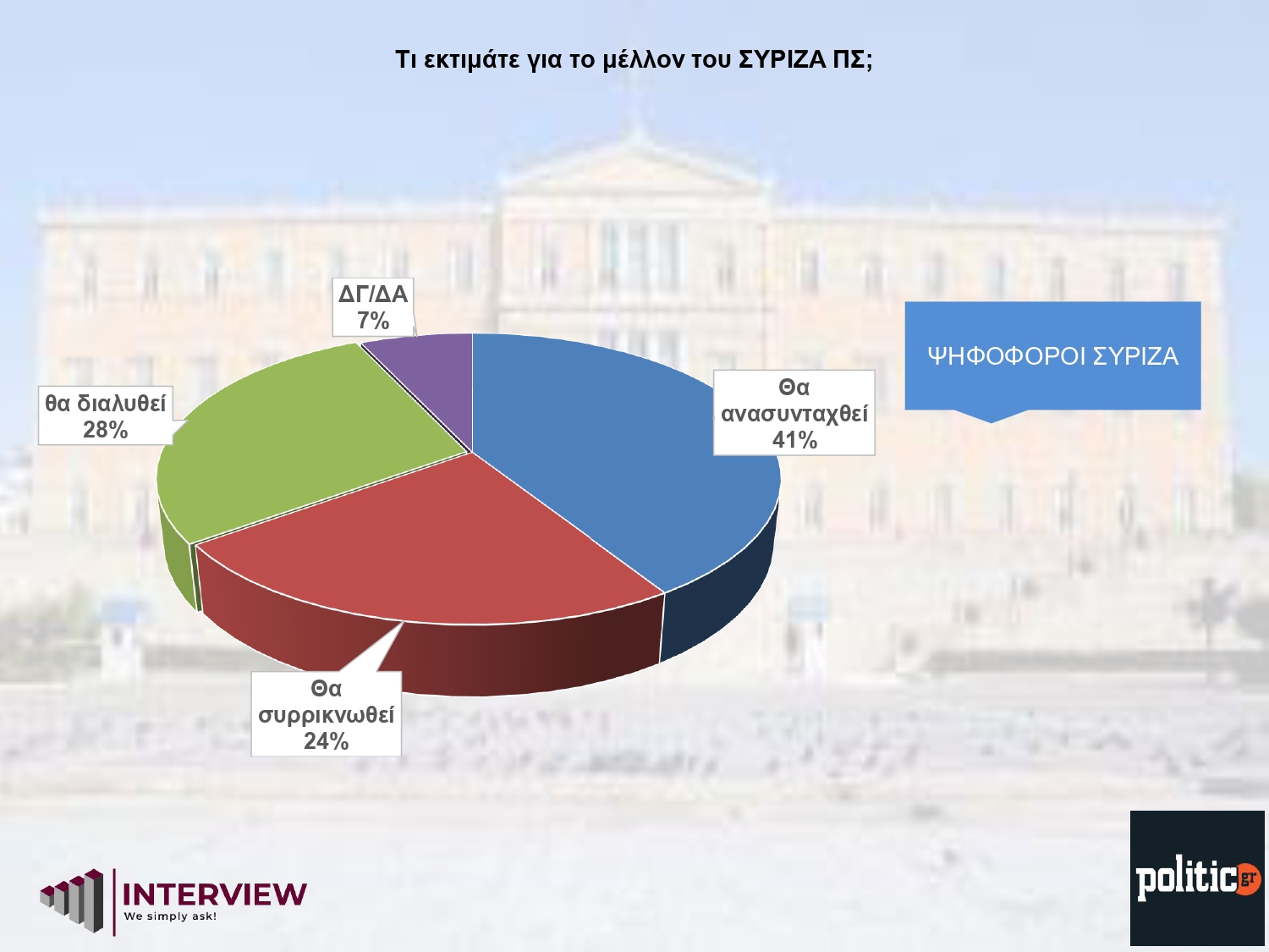Περισσότερο αισιόδοξοι είναι οι ψηφοφόροι του κόμματος. Τρεις στους δέκα λένε ότι θα διαλυθεί ο ΣΥΡΙΖΑ, ενώ τέσσερις στους δέκα ότι θα ανασυνταχθεί.