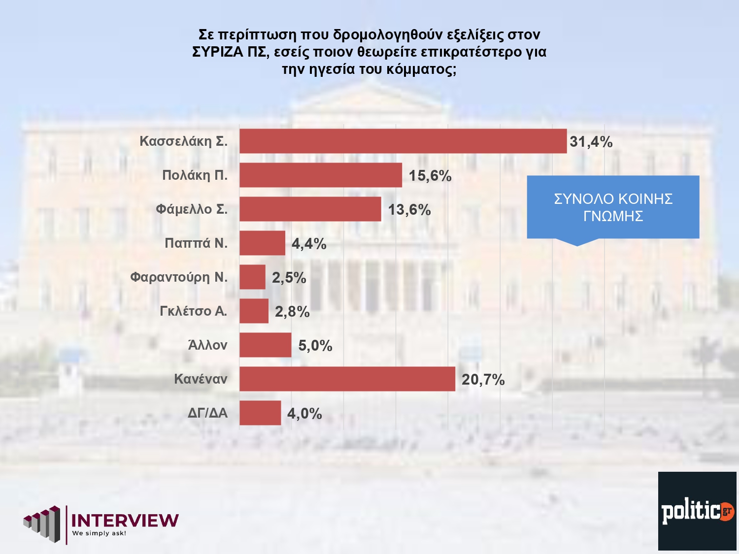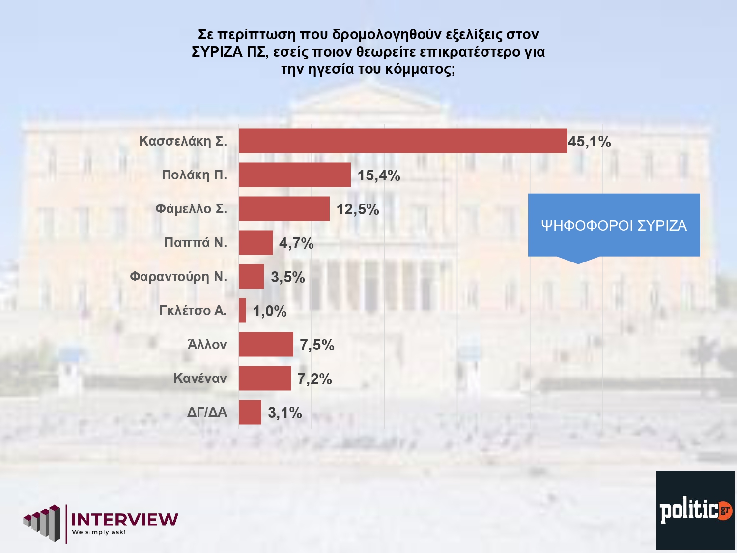 Ο έκπτωτος πρόεδρος του ΣΥΡΙΖΑ ΠΣ – ο οποίος χθες προανήγγειλε την υποψηφιότητά του μέσω μιας φωτογραφίας- Στέφανος Κασσελάκης, έχει καθαρό προβάδισμα για την πρώτη θέση στις εσωκομματικές εκλογές του κόμματος. Με ποσοστό 45% οι ψηφοφόροι του ΣΥΡΙΖΑ ψηφίζουν για πρόεδρο του κόμματος τον Στέφανο Κασσελάκη, έναντι του Παύλου Πολάκη με 15,4% και του Σωκράτη Φάμελλου με 12,5%.