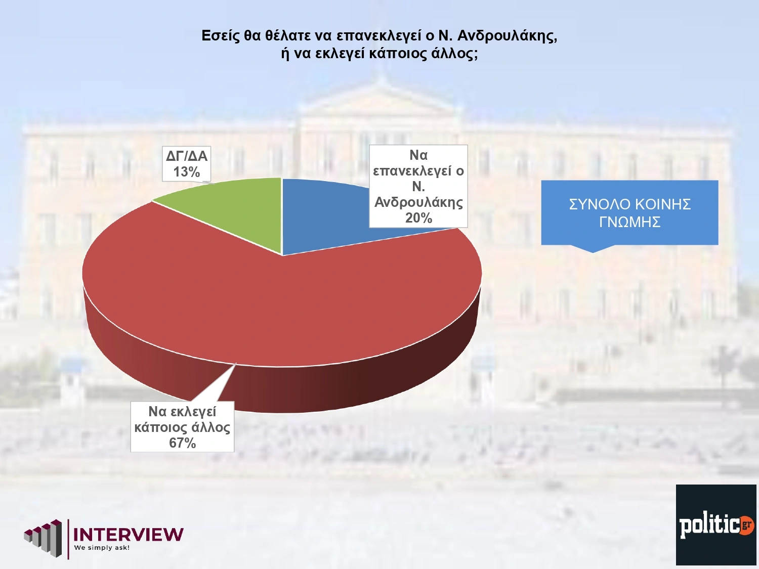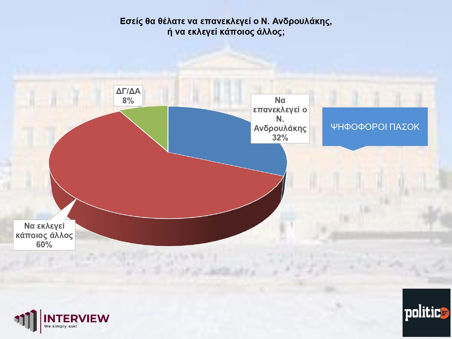 Σύμφωνα με την τελευταία μέτρηση πριν από το σημερινό ντιμπέιτ, τόσο οι ψηφοφόροι του ΠΑΣΟΚ (60%) όσο και αυτοί των άλλων κομμάτων (67%), δεν επιθυμούν την επανεκλογή του Νίκου Ανδρουλάκη στην ηγεσία του κόμματος.