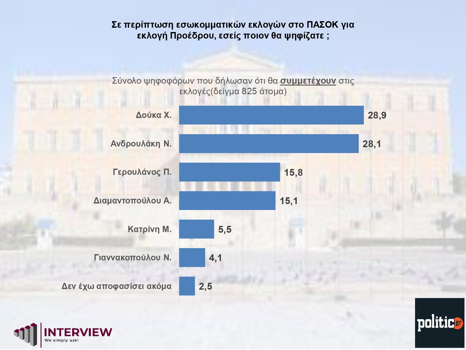 Στην κούρσα για την ανάδειξη του προέδρου του ΠΑΣΟΚ ο Χάρης Δούκας (28,9%) προηγείται με βραχεία κεφαλή έναντι του Νίκου Ανδρουλάκη (28,1%). Στην τρίτη θέση είναι ο Παύλος Γερουλάνος (15,8%) και πολύ κοντά είναι η Άννα Διαμαντοπούλου (15,1%). Ακολουθεί ο Μιχάλης Κατρίνης (5,5%) και η Νάντια Γιαννακοπούλου (4,1%).