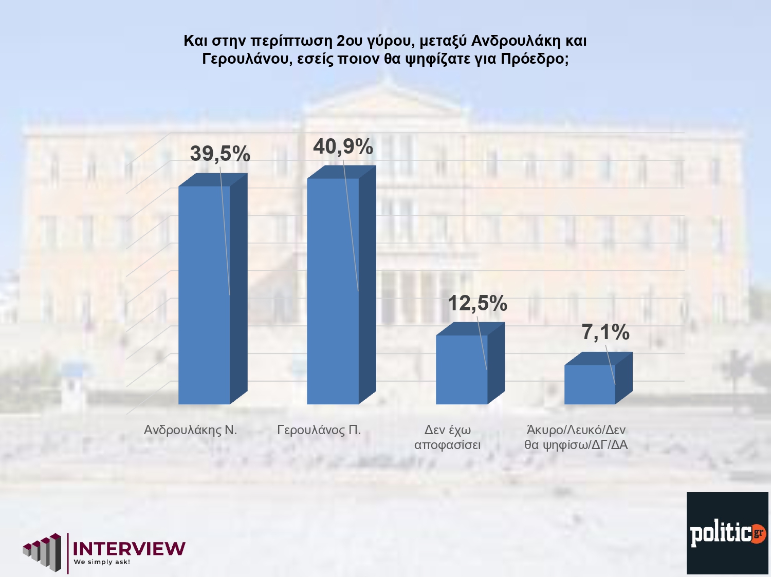 Σε αναμέτρηση μεταξύ Ανδρουλάκη και Γερολάνου, ο Γερουλάνος κερδίζει με 40,9% – 39,5%.