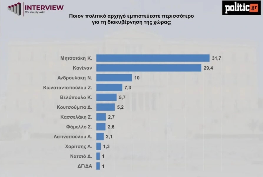 Ο Κυριάκος Μητσοτάκης παραμένει πρώτος στην εμπιστοσύνη των πολιτών, με 31,7%, αυξάνοντας οριακά το ποσοστό του από το 29% που κατέγραψε τον Μάιο. Ψηλά παραμένει η απάντηση «κανέναν», που συγκεντρώνει 29,4% τον Ιούνιο (από 28,8%). Ο Νίκος Ανδρουλάκης διατηρείται στην τρίτη θέση με 10%, σημειώνοντας μικρή άνοδο από το 8,5% του Μαΐου, ενώ η Ζωή Κωνσταντοπούλου παραμένει κοντά, με 7,3% (από 7,9%).