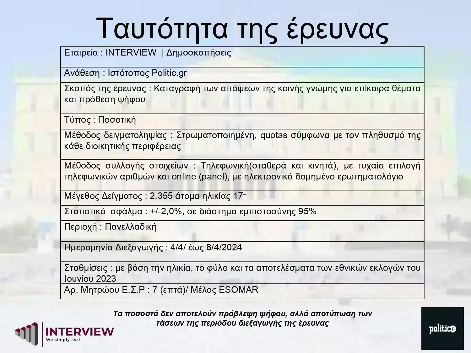 Το κυβερνών κόμμα συνεχίζει να είναι κυρίαρχο στο πολιτικό σκηνικό, αν και με απώλειες, οι οποίες ωστόσο δεν του επιτρέπουν να φτάσει το ποσοστό των ευρωεκλογών του 2019 (33%). Την ίδια στιγμή αποτυπώνεται με σαφήνεια ένα στιγμιότυπο ανόδου για τον ΣΥΡΙΖΑ, ο οποίος “κλειδώνει” τη δεύτερη θέση.