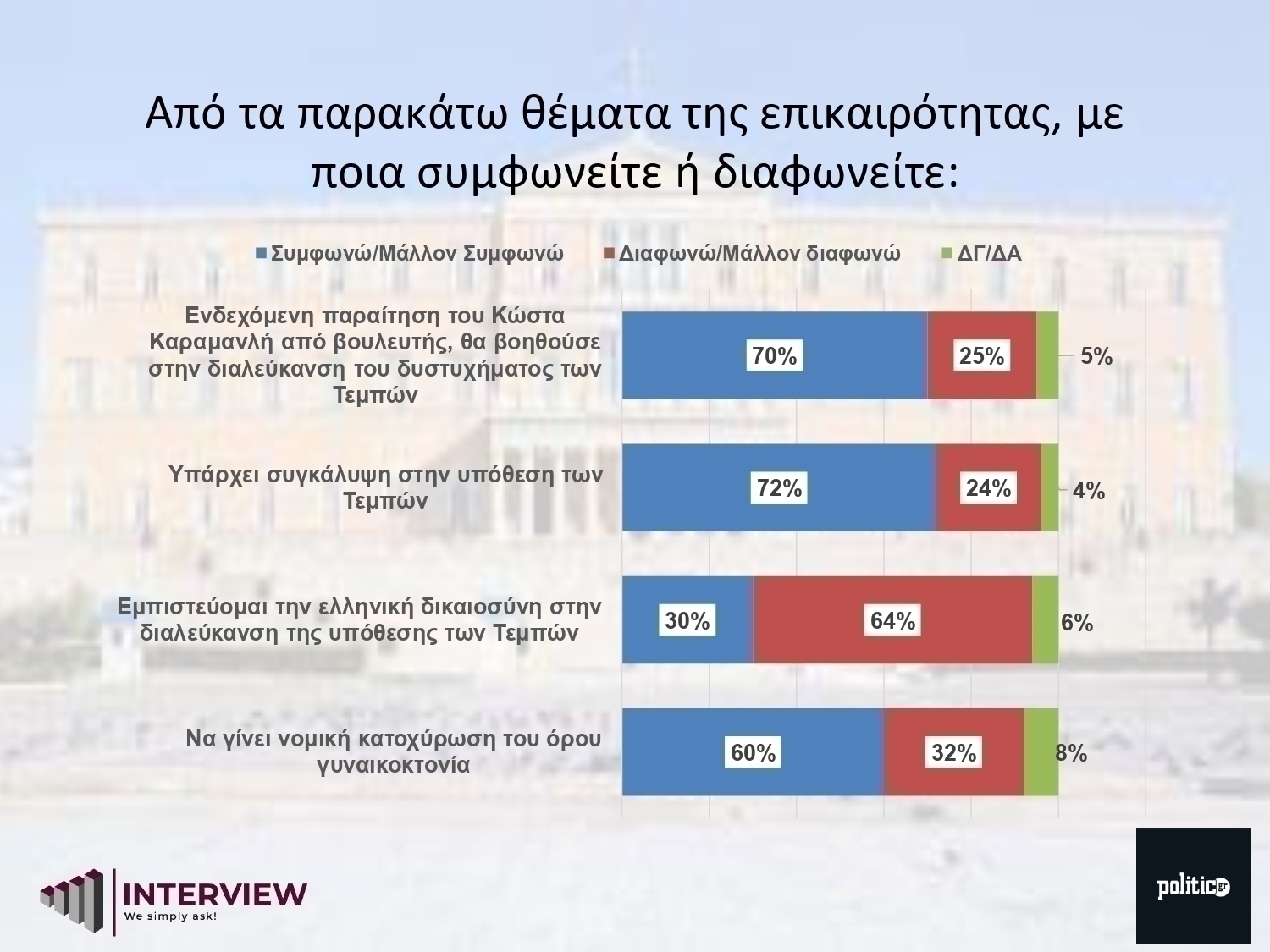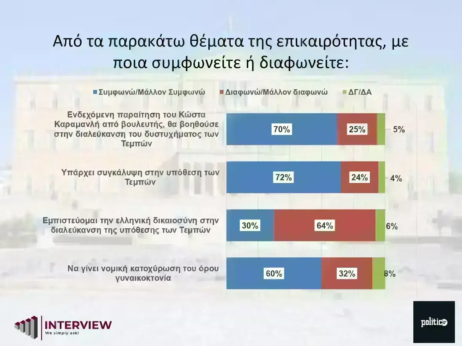 Με βάση τα δεδομένα της έρευνας επιχειρείται να σκιαγραφηθεί η άποψη των πολιτών στα μείζονα κοινωνικοπολιτικά θέματα που απασχολούν την ελληνική κοινωνία το τελευταίο διάστημα. Σύμφωνα με τα αποτελέσματα, οι πολίτες εμφανίζονται ιδιαιτέρως καχύποπτοι ως προς τη δικαίωση που θα αποδοθεί και τη διαφάνεια που πλαισιώνει την υπόθεση των Τεμπών.