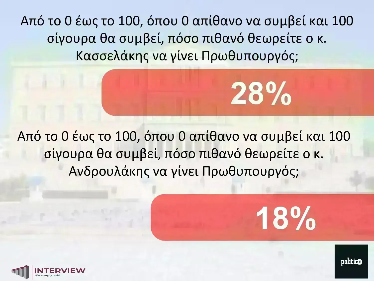 Ενδιαφέρον παρουσιάζει επίσης η καρτέλα σύμφωνα με την οποία, κατά την εκτίμηση των πολιτών, ο πρόεδρος του ΣΥΡΙΖΑ, Στέφανος Κασσελάκης έχει περισσότερες πιθανότητες (28%) σε σύγκριση με τον πρόεδρο του ΠΑΣΟΚ, Νίκο Ανδρουλάκη (18%), να κρατήσει τα ηνία της χώρας ως πρωθυπουργός.