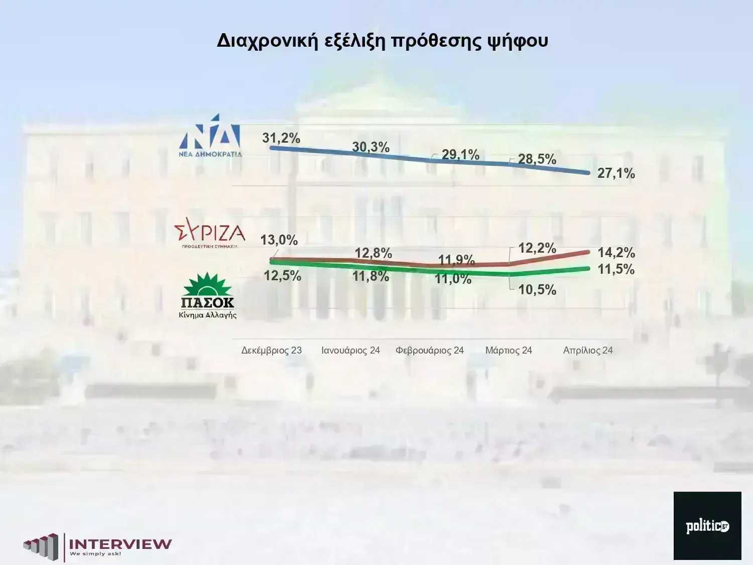 Πιο συγκεκριμένα, η Νέα Δημοκρατία υποχωρεί από το 28,5% στο 27,1% και ο ΣΥΡΙΖΑ ανεβαίνει από το 12,2% στο 14,2%. Μικρή άνοδο σημειώνει και το ΠΑΣΟΚ από το 10,5% στο 11,5%. Τα ποσοστά των υπόλοιπων κομμάτων παραμένουν σε γενικές γραμμές σταθερά.