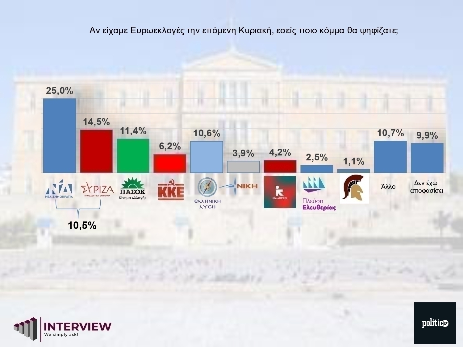 Η ψαλίδα για τις ευρωεκλογές της 9ης Ιουνίου κλείνει στο 10,5% (από το 12,5% τον Μάρτιο και 14,4% τον Φεβρουάριο).