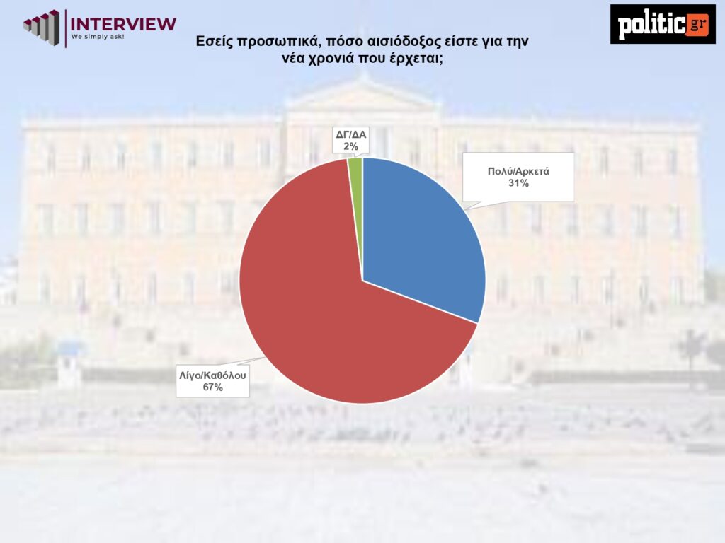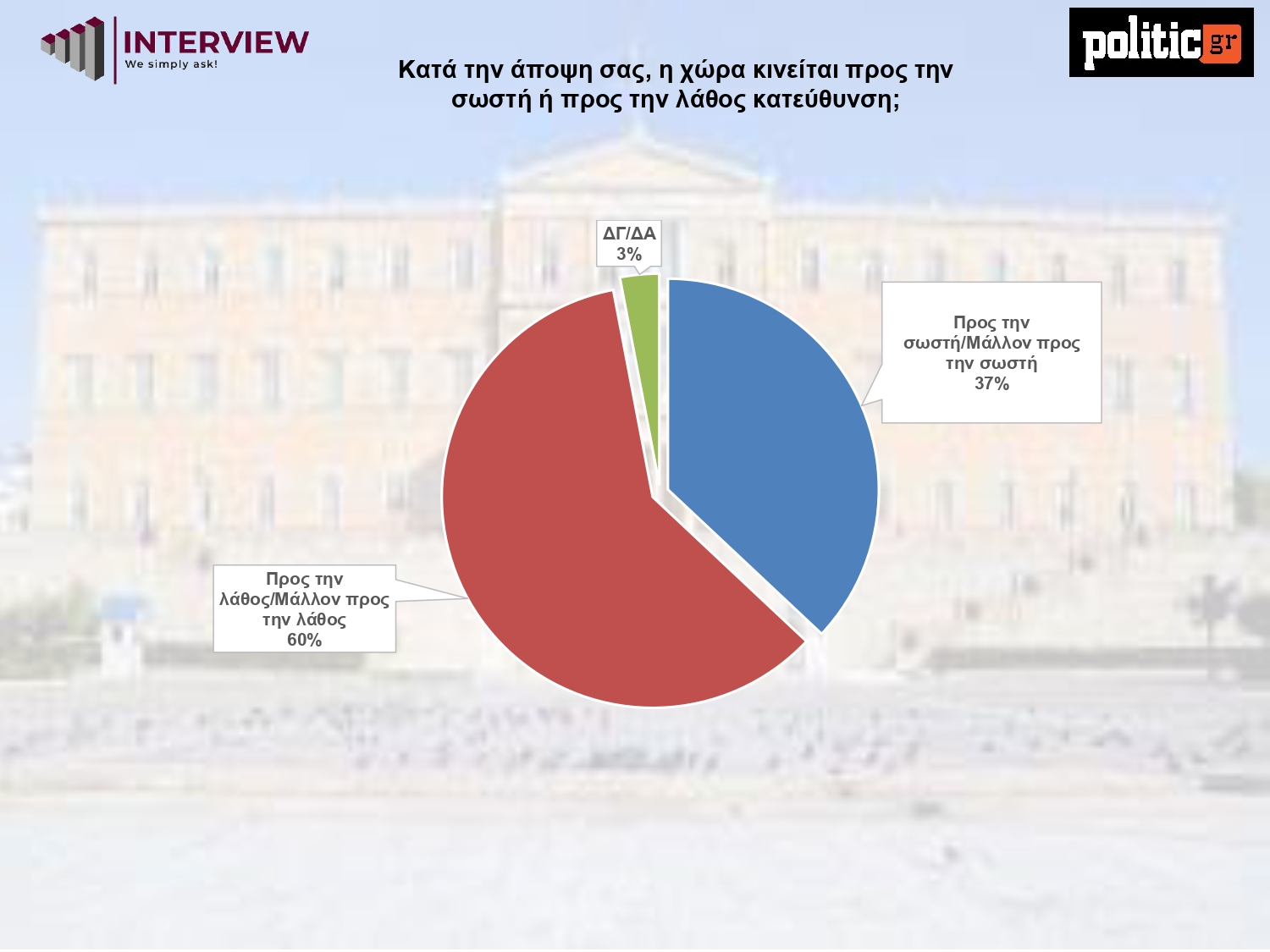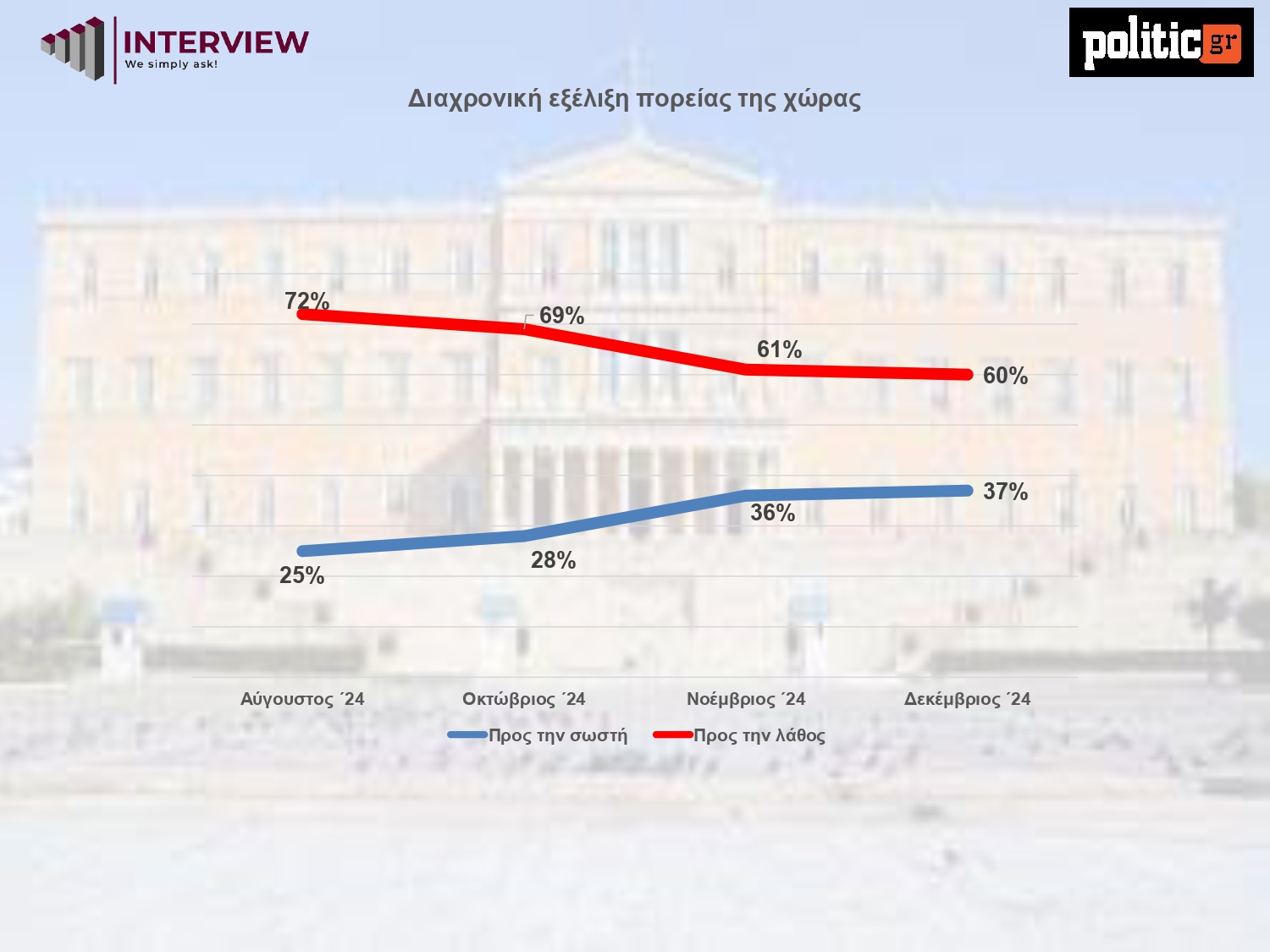 Στην ίδια κατεύθυνση είναι και η καρτέλα που δείχνει μια τάση αισιοδοξίας όσον αφορά την πορεία της χώρας. Αν και οι περισσότεροι θεωρούν πως η χώρα κινείται προς τη λάθος κατεύθυνση (60%), σε αντίθεση με το 37% που κρίνει πως κινείται προς τη σωστή, το αντίστοιχο ποσοστό απαισιοδοξίας (72%) παρουσιάζει φθίνουσα πορεία από τον Αύγουστο, και αντίστοιχα αύξουσα τάση το ποσοστό της αισιοδοξίας (από 25% τον Αύγουστο στο 36% τον Νοέμβριο).