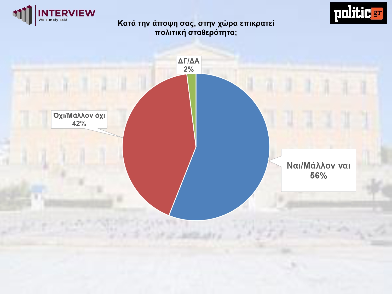 Η αναγωγή της πολιτικής σταθερότητας σε εθνική αναγκαιότητα ήταν από τα βασικά προεκλογικά μηνύματα της ΝΔ, και το γεγονός ότι η πλειοψηφία των ερωτηθέντων (56%) θεωρεί ότι στη χώρα επικρατεί πολιτική σταθερότητα δείχνει ότι το κυβερνών κόμμα κέρδισε το συγκεκριμένο στοίχημα. Ωστόσο, το 42% των πολιτών που διαφωνούν μαρτυρά ότι υπάρχει ακόμη μια ισχυρή βάση δυσαρέσκειας.