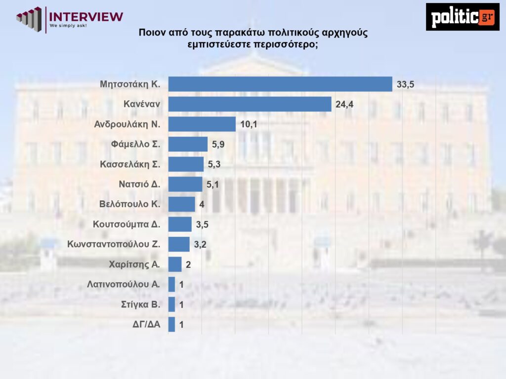 Ο πρωθυπουργός παραμένει με διαφορά στην κορυφή της εμπιστοσύνης των πολιτών, και έτσι διατηρεί την ηγετική του εικόνα. Στη δεύτερη θέση στο ζήτημα της εμπιστοσύνης είναι ο «κανένας», γεγονός που υπογραμμίζει μια βαθιά κρίση εμπιστοσύνης στο πολιτικό σύστημα της αντιπολίτευσης. Ο πρόεδρος του ΠΑΣΟΚ, Νίκος Ανδρουλάκης βρίσκεται στην τρίτη θέση, ο Σωκράτης Φάμελλος και ο Στέφανος Κασσελάκης στην τέταρτη και πέμπτη αντίστοιχα.