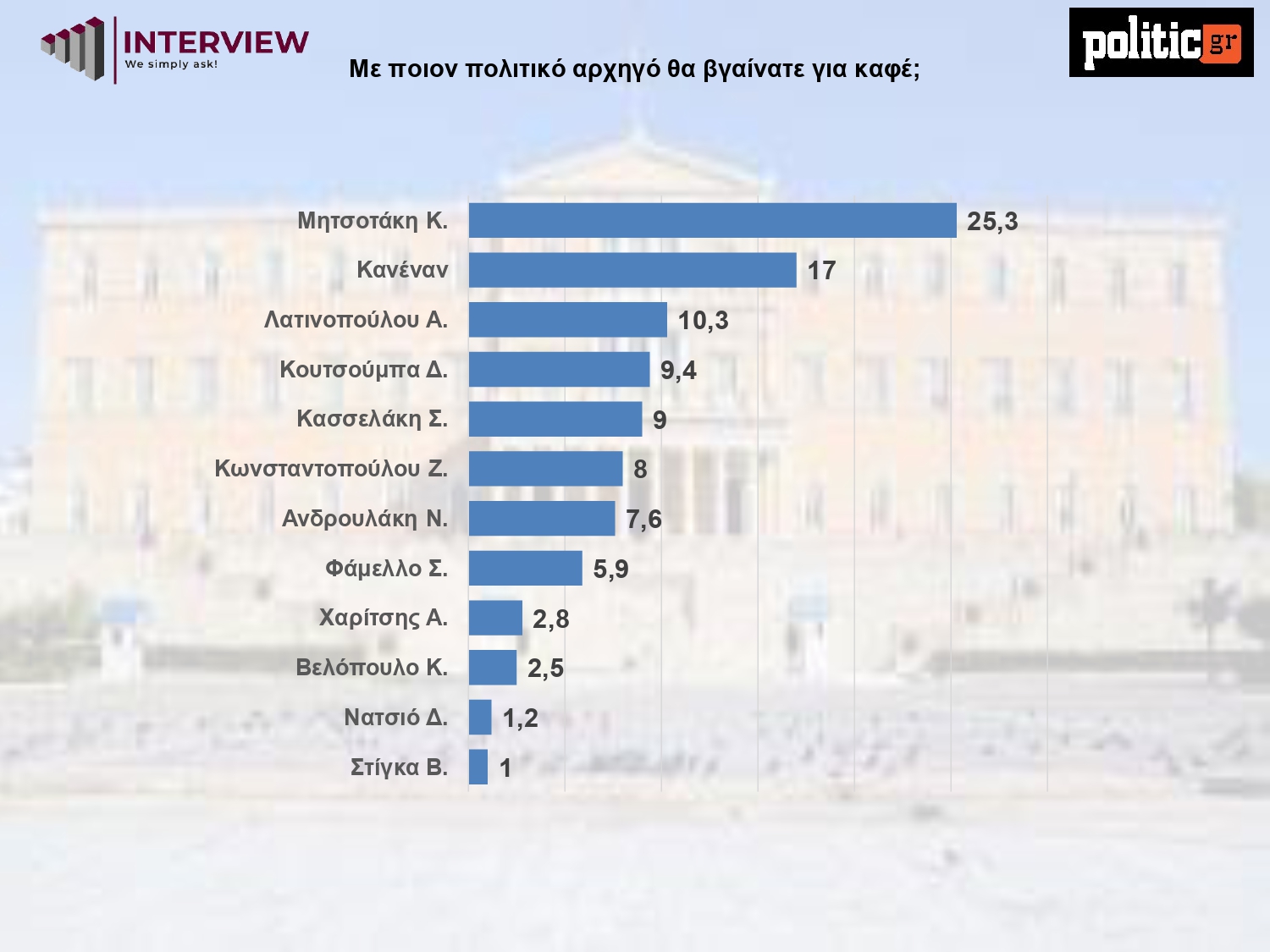Ιδιαίτερο ενδιαφέρον παρουσιάζει και η καρτέλα με τη ερώτηση: «Με ποιον πολιτικό αρχηγό θα βγαίνατε για καφέ;». Πρώτος σε προτίμηση έρχεται ο πρωθυπουργός και στη δεύτερη θέση είναι ο «κανένας», δηλαδή οι ερωτηθέντες θα προτιμούσαν να πιούν μόνοι τους τον καφέ παρά συνοδευόμενοι από κάποιον άλλον πολιτικό αρχηγό. Στη τρίτη θέση είναι η Α. Λατινοπούλου, στην τέταρτη ο Δ. Κουτσούμπας και στην πέμπτη ο Στ. Κασσελάκης.