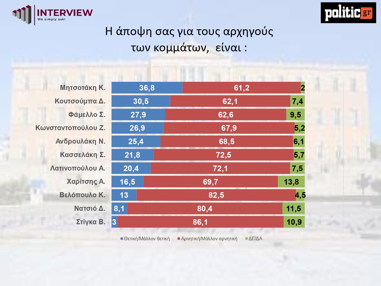 Ο πρωθυπουργός Κ. Μητσοτάκης εμφανίζεται ως ο δημοφιλέστερος πολιτικός αρχηγός με θετική άποψη που φτάνει το 36,8%. Σε σύγκριση με τον προηγούμενο μήνα (39%) σημειώνει μια μικρή πτώση. Ακολουθεί ο Δ. Κουτσούμπας με 30,5%, ο Σ. Φάμελλος με 27,9%, η Ζ. Κωνσταντοπούλου με 26,9%, ο Ν. Ανδρουλάκης με 25,4%, ο Στ. Κασσελάκης με 21,8%, η Α. Λατινοπούλου με 20,4%, ο Α. Χαρίτσης με 16,5%, ο Κ. Βελόπουλος με 13%, ο Δ. Νατσιός με 8,1% και ο Β. Στίγκας με 3%.