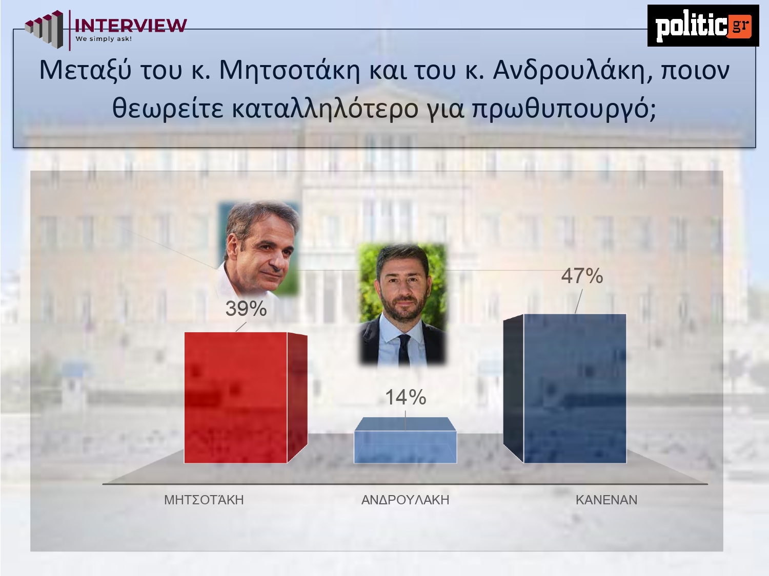 Στην καταλληλότητα πρωθυπουργού ο «Κανένας» (47%) είναι πρώτος σε σχέση με τους προέδρους των δύο πρώτων κομμάτων. Ο Μητσοτάκης είναι στο 39% και ο Ανδρουλάκης αρκετά χαμηλότερα στο 14%.
