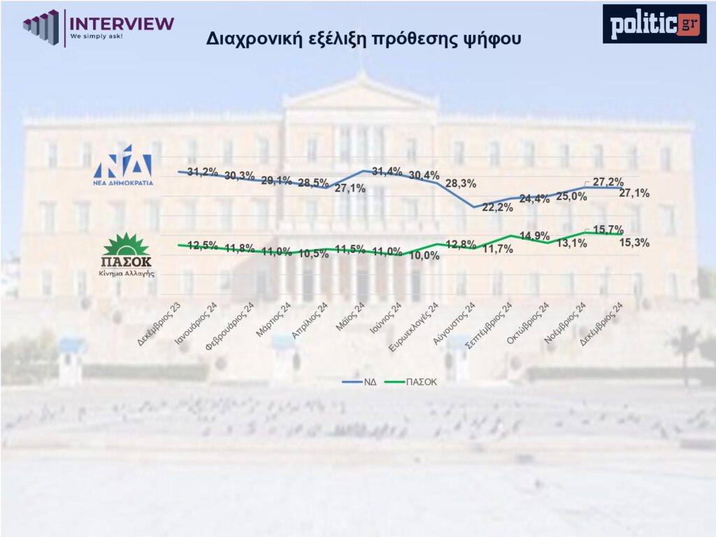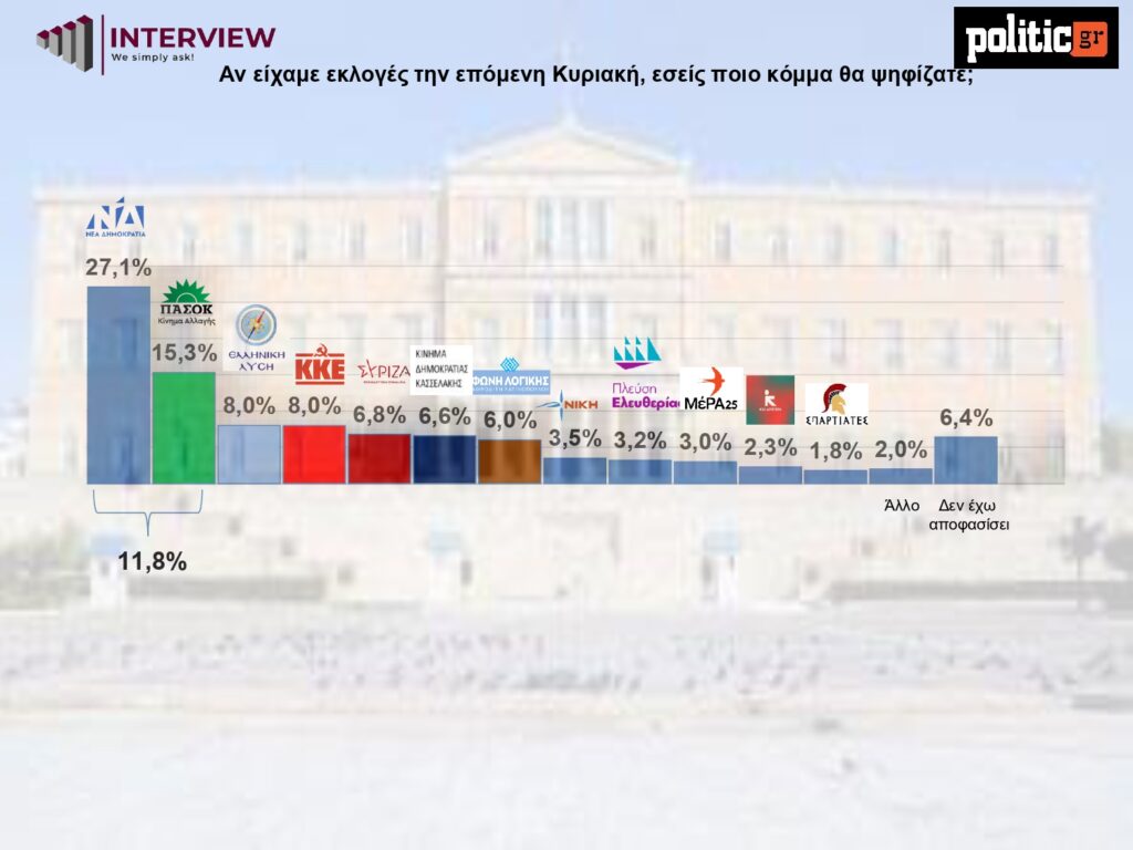 Συγκεκριμένα, το κυβερνών κόμμα, η Νέα Δημοκρατία παραμένει στην κορυφή με ποσοστό 27,1%. Το ΠΑΣΟΚ – Κίνημα Αλλαγής εδραιώνεται στη δεύτερη θέση (15,3%), ενώ το ΚΚΕ και η Ελληνική Λύση εμφανίζονται να ισοψηφούν στην τρίτη θέση με 8%. Ακολουθεί ο ΣΥΡΙΖΑ ο οποίος ανεβαίνει από το 4,3% στο 6,8%, και πολύ κοντά είναι το Κίνημα Δημοκρατίας (Κασσελάκης) (6,6%) και η Φωνή Λογικής (6%). Η Νίκη είναι στο 3,5%, η Πλεύση Ελευθερίας στο 3,2% και η ΜέΡΑ25 στο 3%. Το ποσοστό των αναποφάσιστων ψηφοφόρων είναι 6,4%.