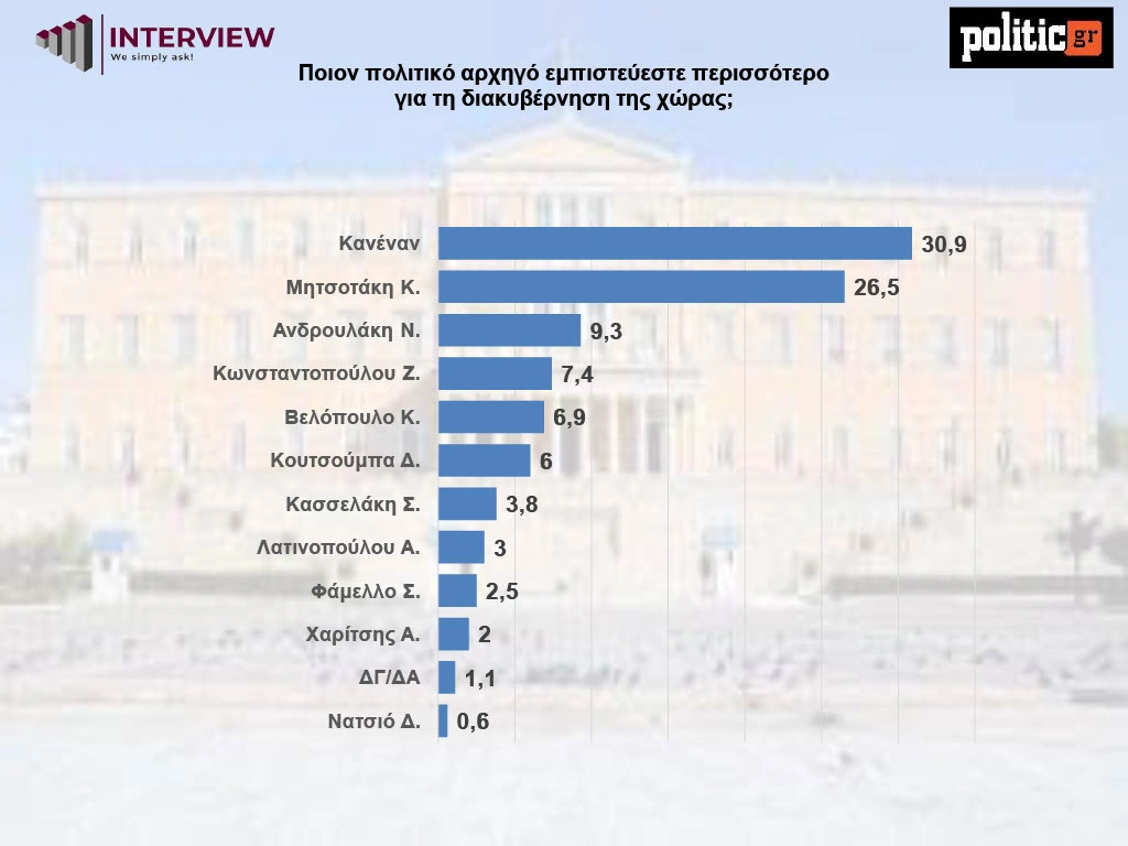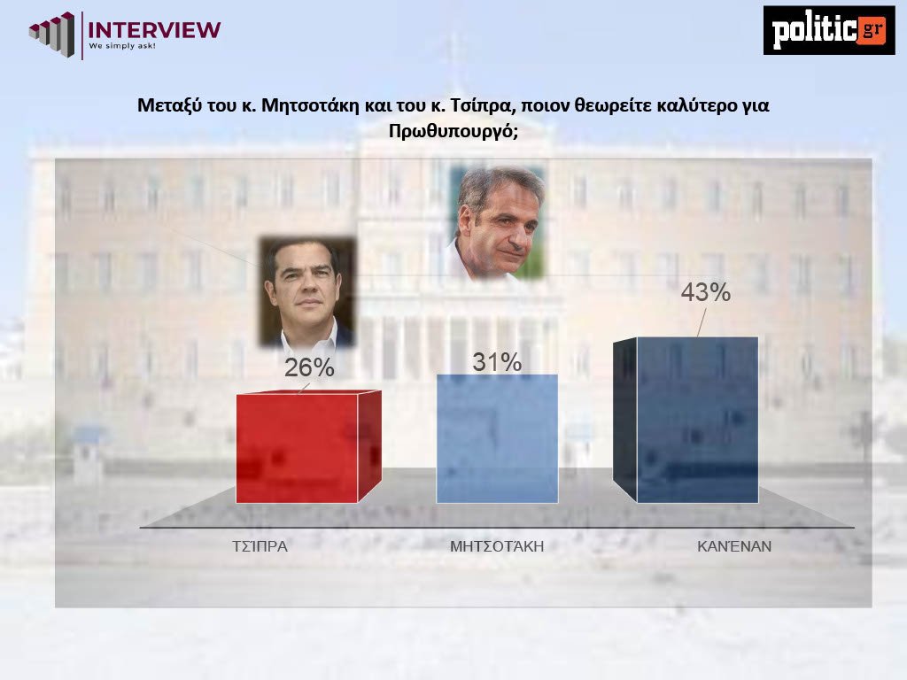 Σχετικά με την καταλληλότητα για πρωθυπουργό, ο Κυριάκος Μητσοτάκης συγκεντρώνει το 31%, ο Αλέξης Τσίπρας ακολουθεί στο 26%, ενώ η επιλογή «κανένας» καταγράφει το υψηλότερο ποσοστό με 43%.