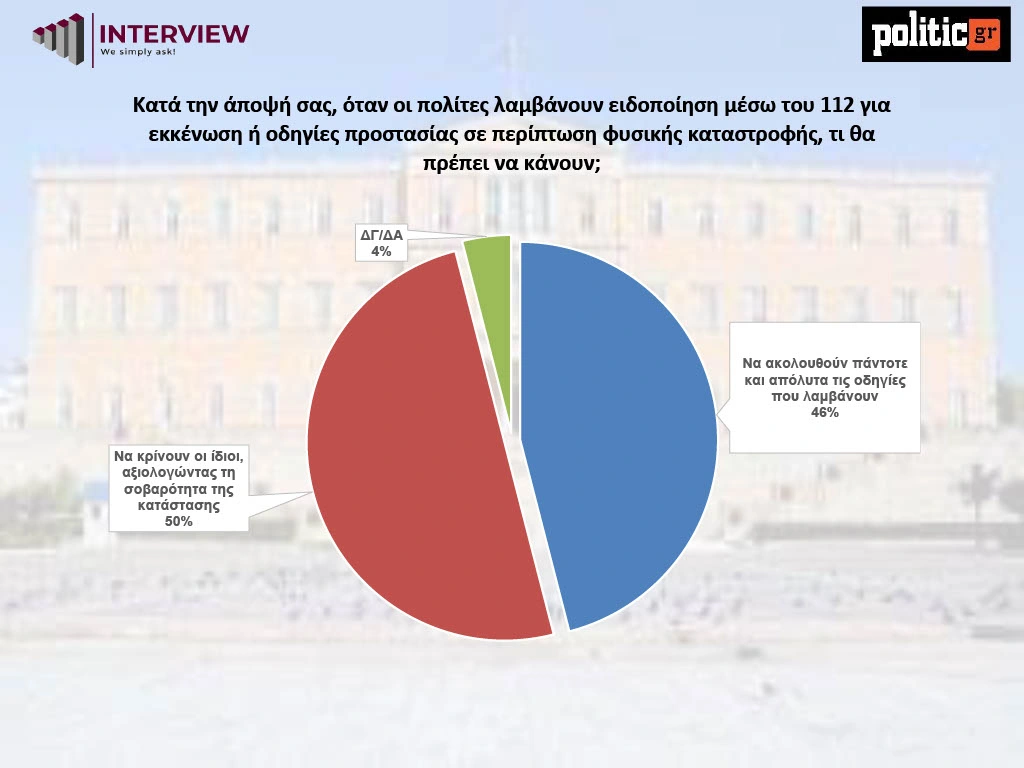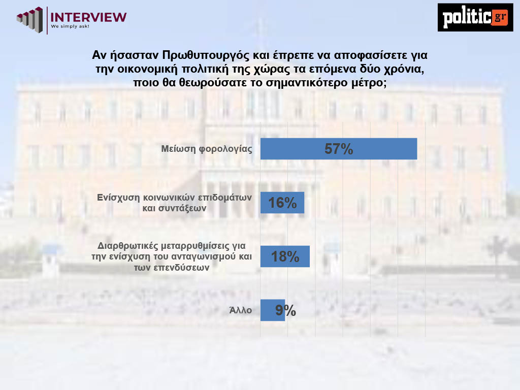 Στο ερώτημα ποιο μέτρο θεωρούν σημαντικότερο για την οικονομική πολιτική της χώρας την επόμενη διετία, οι πολίτες απαντούν κατηγορηματικά: το 57% ζητά μείωση της φορολογίας. Αντιθέτως, μόλις το 16% θεωρεί προτεραιότητα την ενίσχυση κοινωνικών επιδομάτων και συντάξεων, ενώ το 18% επιλέγει διαρθρωτικές μεταρρυθμίσεις για επενδύσεις και ανταγωνιστικότητα.
