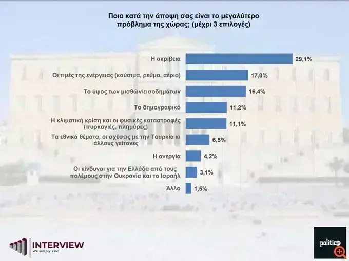 Όσον αφορά τα μεγαλύτερα προβλήματα που αντιμετωπίζει η χώρα, οι πολίτες αναδεικνύουν την ακρίβεια ως το κυριότερο, με ποσοστό 29,1%. Ακολουθούν οι τιμές της ενέργειας (17,0%) και το ύψος των μισθών και των εισοδημάτων (16,4%). Μόλις ένας στους δέκα θεωρεί το δημογραφικό (11,2%) και την κλιματική κρίση και τις φυσικές καταστροφές (11,1%) ως το μεγαλύτερο πρόβλημα της χώρας.