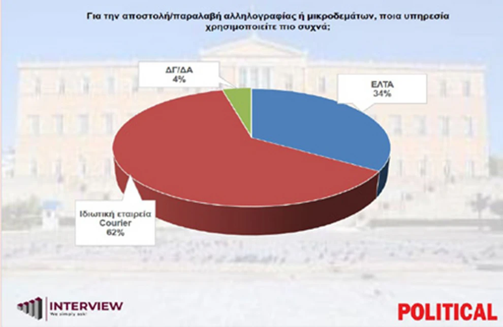 Για την υπόθεση των ΕΛΤΑ με το 62% να απαντά ότι προτιμά τις ιδιωτικές εταιρείες courier για αποστολή/παραλαβή αλληλογραφίας ή μικροδεμάτων, έναντι 34% που επιλέγει τα ΕΛΤΑ και 4% που απαντά ΔΞ/ΔΑ.