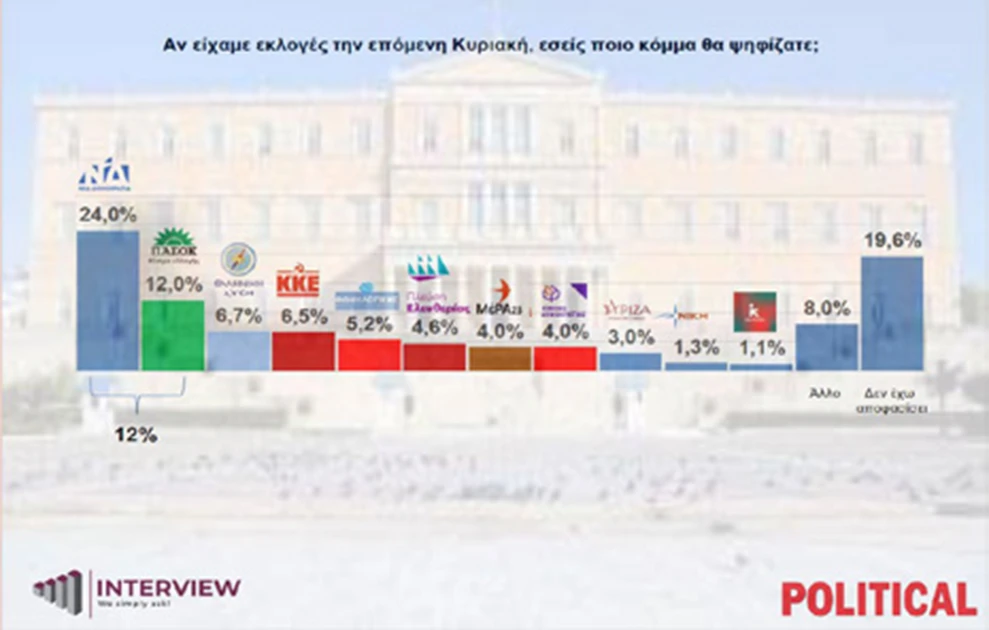 Στην εκτίμηση εκλογικού αποτελέσματος, η ΝΔ εξασφαλίζει ποσοστό 29,2%, το ΠΑΣΟΚ 15%, η Ελληνική Λύση 8,1%, το ΚΚΕ 7,9%, η Φωνή Λογικής 6%,η Πλεύση Ελευθερίας 5,7%, το ΜέΡΑ25 5,3%, το Κίνημα Δημοκρατίας 5%, ο ΣΥΡΙΖΑ 3,7%, η Νίκη 1,6%, η Νέα Αριστερά 1,4% και άλλο το 11,1%. Στην πρόθεση ψήφου το 24% λέει ότι θα ψήφιζε τη ΝΔ, το 12% το ΠΑΣΟΚ, το 6,7 % την Ελληνική Λύση, το 6,5% το ΚΚΕ, το 5,2% τη Φωνή Λογικής, το 4,6% την Πλεύση Ελευθερίας, το 4% το ΜέΡΑ25, το Κίνημα Δημοκρατίας το 4%, τον ΣΥΡΙΖΑ το 3%, ενώ οι αναποφάσιστοι αγγίζουν το 19,6%.