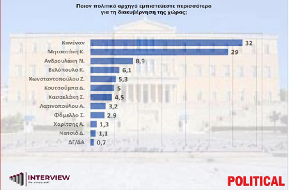 Ο Κυριάκος Μητσοτάκης στην ερώτηση ποιον πολιτικό εμπιστεύεστε πιο πολύ για τη διακυβέρνηση της χώρας συγκεντρώνει ποσοστό 29%. Στην πρώτη θέση παραμένει ο «Κανένας» με ποσοστό 32%, και ακολουθούν ο Ν. Ανδρουλάκης με 8,9%, ο Κυριάκος Βελόπουλος με 6,1%, η Ζωή Κωνσταντοπούλου με 5,3%, ο Δημήτρης Κουτσούμπας με 5%, ο Στέφανος Κασσελάκης με 4,5%, η Αφροδίτη Λατινοπούλου με 3,2%, ο Σωκράτης Φάμελλος με 2,9%. Αναφορικά με τη επιστροφή του Αλέξη Τσίπρα στην πολιτική, το 29% τη βλέπει θετικά/μάλλον θετικά, το 67% αρνητικά/μάλλον αρνητικά και το 6% ΔΞ/ΔΑ. Στην ερώτηση αν «θα αγοράζατε το βιβλίο του Αλ. Τσίπρα «Ιθάκη», το 22% απαντά ναι/μάλλον ναι, το 75% όχι/μάλλον όχι και το 3% ΔΞ/ΔΑ.