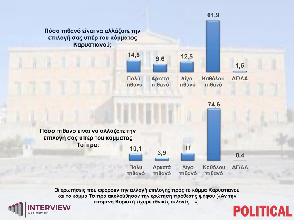 Στην ερώτηση «Πόσο πιθανό είναι να αλλάζατε την επιλογή σας υπέρ του κόμματος Καρυστιανού, αν την επόμενη Κυριακή είχαμε εθνικές εκλογές;», κυριάρχησε το «καθόλου πιθανό» με ποσοστό 61,9%, ενώ στην ίδια ερώτηση για το κόμμα του Αλέξη Τσίπρα, το «καθόλου πιθανό» λαμβάνει ποσοστό 74,6%. Το μεγαλύτερο ποσοστό των ψηφοφόρων, όσον αφορά το κόμμα Καρυστιανού, ανήκει στους αναποφάσιστους (28,5%) και ακολουθούν «άλλο» (25,6%) και στη συνέχεια Πλεύση Ελευθερίας (11,3%) και ΜέΡΑ25 (10,2%).