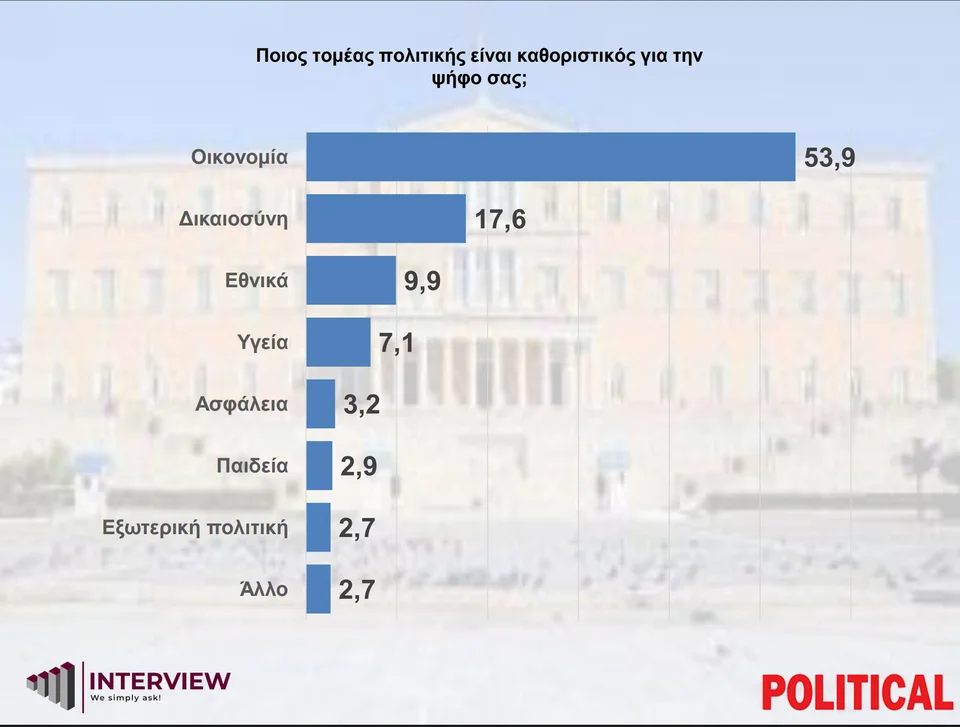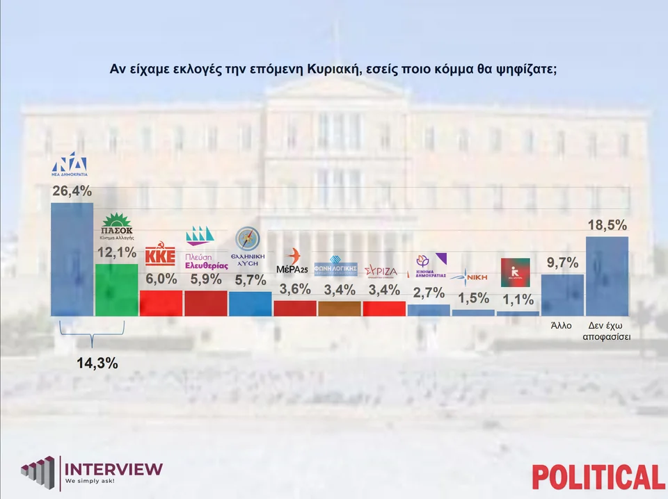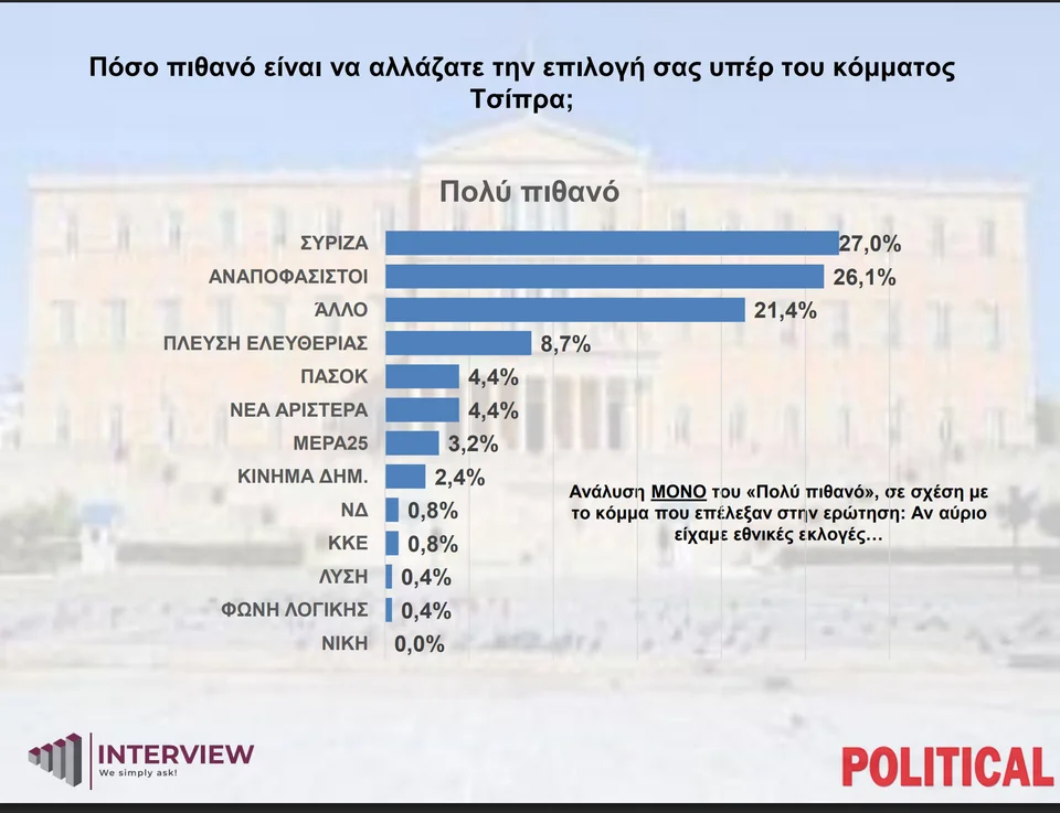 Όσον αφορά τους ψηφοφόρους που επέλεξαν «πολύ πιθανό» να ψηφίσουν το κόμμα του Αλέξη Τσίπρα, το 27% προέρχεται από τον ΣΥΡΙΖΑ, το 25,1% είναι αναποφάσιστοι και ακολουθεί «άλλο» με 21,4%. Στην ερώτηση «Αν είχαμε εκλογές την επόμενη Κυριακή, ποιο κόμμα θα ψηφίζατε;» (χωρίς τα κόμματα Καρυστιανού – Τσίπρα), η ΝΔ προηγείται με διαφορά 14,3 μονάδων έναντι του ΠΑΣΟΚ. Το κυβερνών κόμμα λαμβάνει 26,4%, το ΠΑΣΟΚ 12,1%, το ΚΚΕ 6%, η Πλεύση Ελευθερίας 5,9%, η Ελληνική Λύση 5,7%, το ΜέΡΑ25 3,6%, η Φωνή Λογικής 3,4% και ο ΣΥΡΙΖΑ 3,4%.