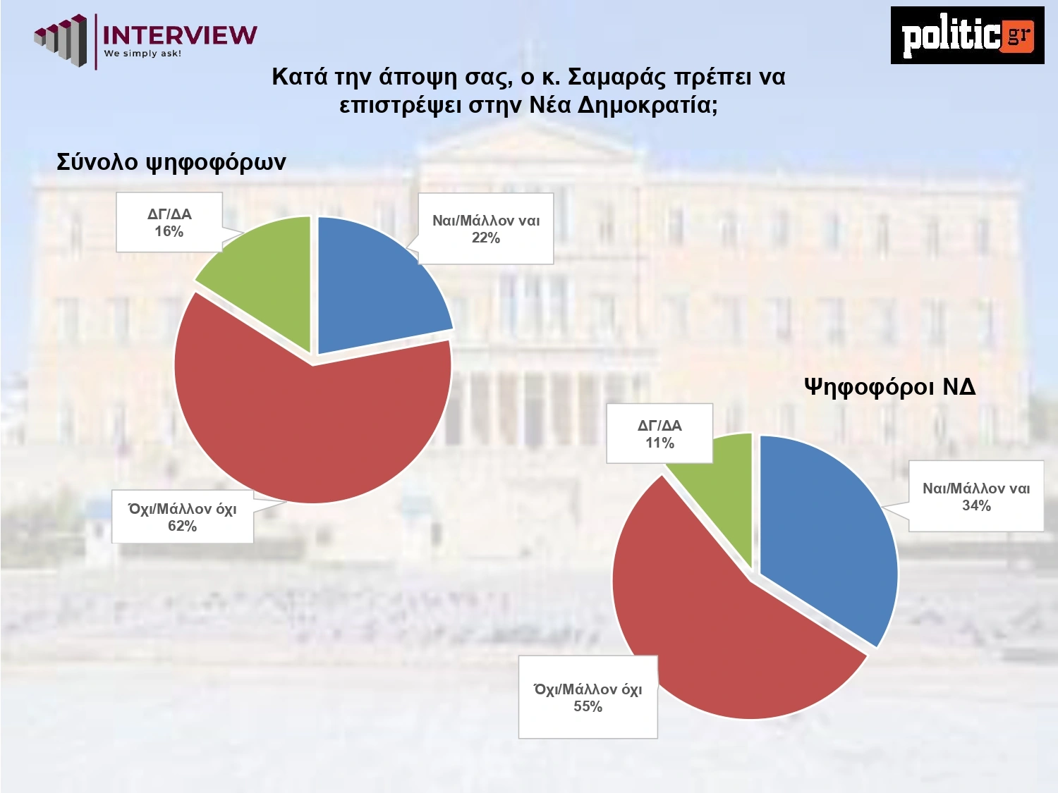 Σχετικά με το ερώτημα για το αν ο Αντώνης Σαμαράς πρέπει να επιστρέψει στη ΝΔ, η πλειοψηφία του εκλογικού σώματος εκφράζεται αρνητικά: το 62% απαντά «όχι/μάλλον όχι», το 22% «ναι/μάλλον ναι» και το 16% δεν παίρνει θέση. Ανάμεσα στους ψηφοφόρους της ΝΔ η εικόνα διαφοροποιείται, με το 34% να βλέπει θετικά την επιστροφή, το 55% να διαφωνεί και το 11% να δηλώνει ουδέτερο. Τα στοιχεία δείχνουν ότι, αν και ο κ. Σαμαράς εξακολουθεί να διαθέτει επιρροή σε ένα τμήμα της βάσης, η πλειοψηφία των πολιτών —ακόμη και εντός της ΝΔ— δεν φαίνεται να επιθυμεί μια θεσμική του επάνοδο.