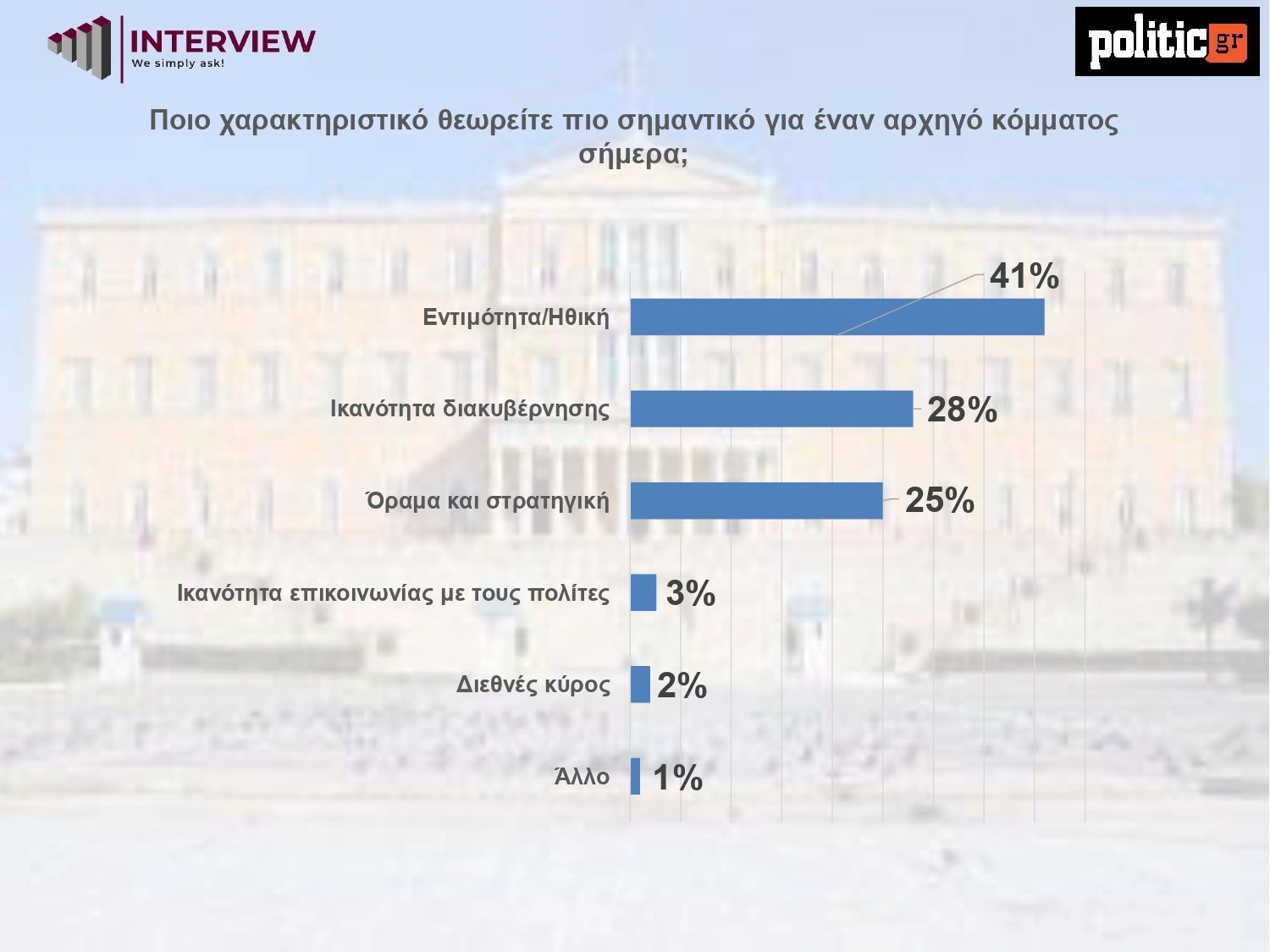 Σαφές μήνυμα προς το πολιτικό σύστημα στέλνουν οι πολίτες σχετικά με τα χαρακτηριστικά που θεωρούν πιο σημαντικά για έναν αρχηγό κόμματος. Η «εντιμότητα και ηθική» αναδεικνύεται σε κυρίαρχο κριτήριο με 41%, αφήνοντας πίσω την «ικανότητα διακυβέρνησης» (28%) και το «όραμα και στρατηγική» (25%). Στην τελευταία θέση βρίσκονται η «ικανότητα επικοινωνίας με τους πολίτες» (3%) και το «διεθνές κύρος» (2%), γεγονός που καταδεικνύει ότι οι πολίτες αναζητούν πρωτίστως καθαρότητα και αξιοπιστία, και λιγότερο επικοινωνιακά τρικ ή εξωτερική εικόνα.