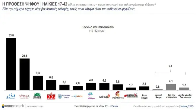 Οι ηλικίες 17 έως 42 ετών στην πρόθεση ψήφου δίνουν πρωτιά στη ΝΔ και φέρνουν τον ΣΥΡΙΖΑ στη δεύτερη θέση. Αναλυτικά: