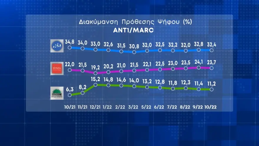 Στην πρόθεση ψήφου η Νέα Δημοκρατία συγκεντρώνει 32,4%, ο ΣΥΡΙΖΑ 23,7%, το ΠΑΣΟΚ 11,2%, το ΚΚΕ 5,2%, η Ελληνική Λύση 4,4% και το ΜέΡΑ 25 3,1%.