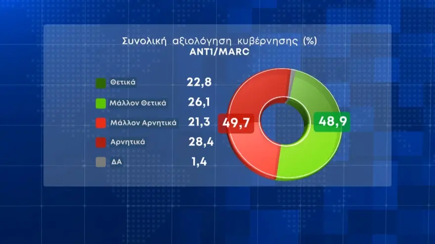 Το 48,9% αξιολογεί θετικά την κυβέρνηση ενώ αρνητικά την κρίνει το 49,7% των ερωτηθέντων. Στην αξιολόγηση για τον ΣΥΡΙΖΑ το 74,2% κρίνει αρνητικά το κόμμα της αξιωματικής αντιπολίτευσης.