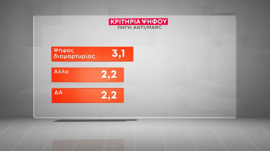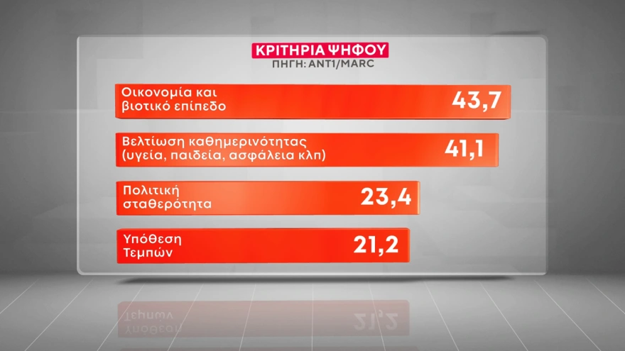 Με ποσοστό 41,1% ο κόσμος θα επέλεγε με βάση την βελτίωση της καθημερινότητας (υγεία, παιδεία, ασφάλεια κλπ), με ποσοστό 23,4% με άξονα την πολιτική σταθερότητα, το 21,2% με βάση την υπόθεση των Τεμπών, το 19% με βάση την βελτίωση της λειτουργίας των θεσμών και του κράτους. Μόλις το 16,1% θα ψήφιζε με κριτήριο το πρόσωπο του αρχηγού.